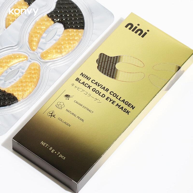 Nini Caviar Collagen Black Gold Eye Mask [8g x 7pcs] แผ่นมาสก์บำรุงใต้ตา อุดมด้วยสารสกัดจากคาเวียร์ ไข่มุกดำ คอลลาเจน และเห็ดทรัฟเฟิลดำ ช่วยบำรุงผิวรอบดวงตาให้เรียบเนียน ชุ่มชื้น กระชับ และเติมความชุ่มชื้นให้กับผิว พร้อมลดรอยคล้ำใต้ตา และลดอาการบวม• อุดมด้วยสารสกัดจากคาเวียร์ ไข่มุกดำ คอลลาเจน และเห็ดทรัฟเฟิลดำ