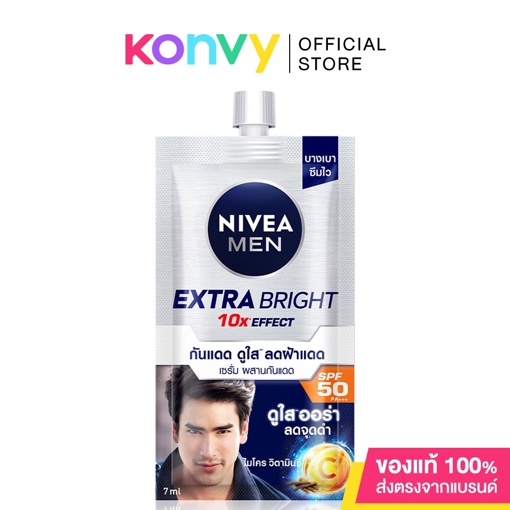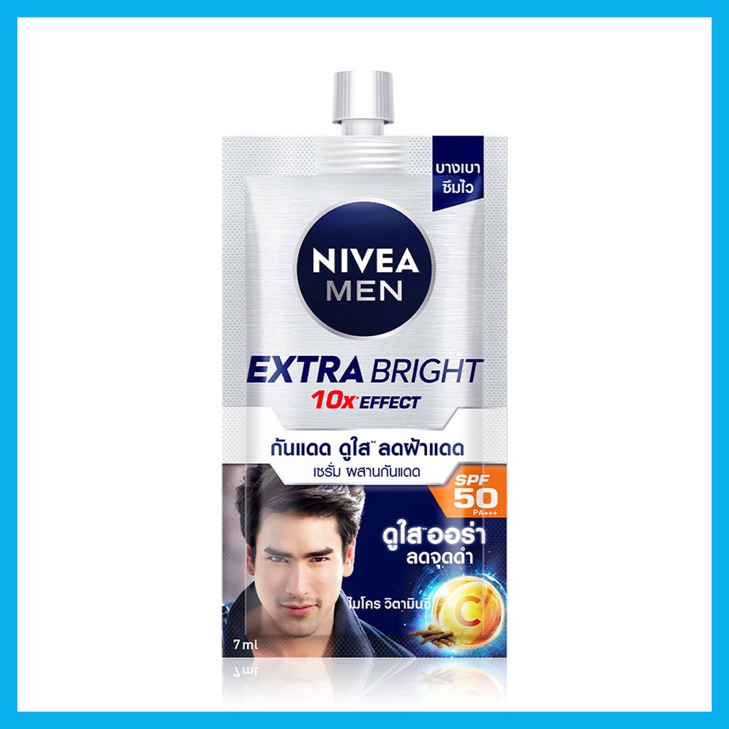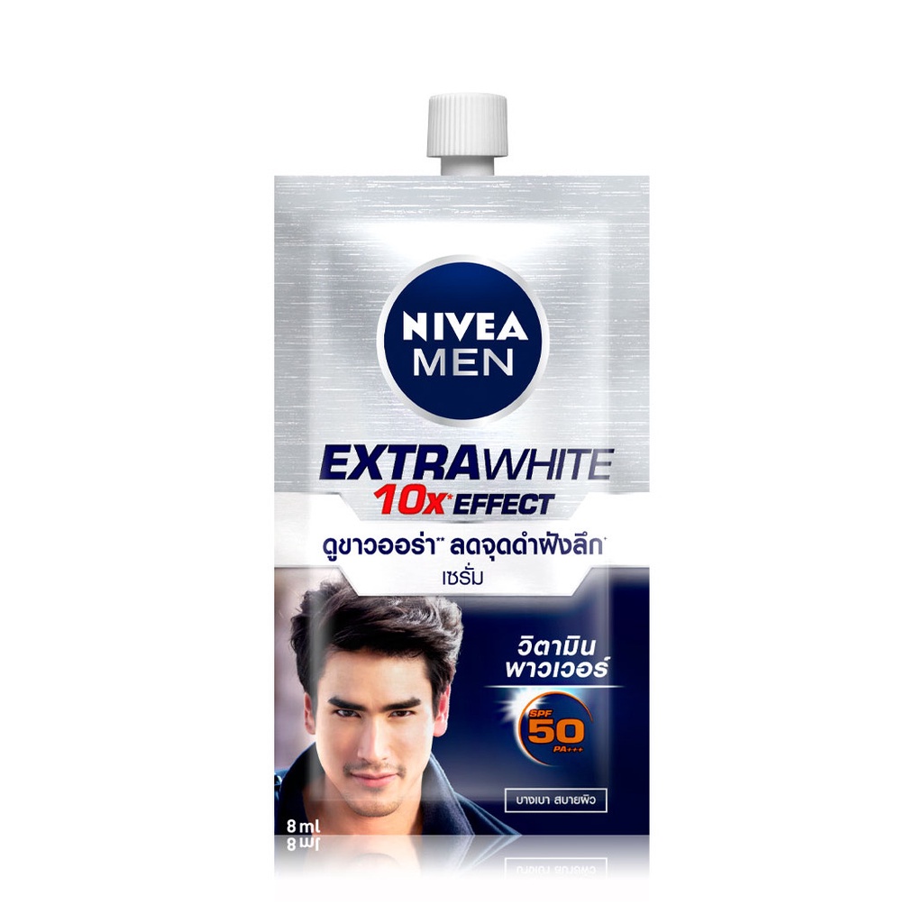 NIVEA Men Extra White Serum SPF50 7gสีผิวสม่ำเสมอ จุดด่างดำลดเลือนกับเซรั่มซึมซาบเร็วล้ำลึกสำหรับผู้ชายเพื่อผิวดูกระจ่างใสเนียนออร่าห่างไกลจุดด่างดำฝังลึกสูตรบางเบาสบายผิวผสานพลังวิตามินพาวเวอร์ช่วยฟื้นบำรุงผิวพร้อมสารสกัดไวท์บูสท์ฟื้นบำรุงผิวคล้ำเสียและลดเลือนจุดด่างดำฝ้าแดดฝังลึกถึงชั้นในผิวได้อย่างมีประสิทธิภาพปกป้องแดดด้วยSPF50 ให้ผิวดูสว่างใสเนียนออร่าแม้ต้องเผชิญแดดแรงทุกวัน•ลดเลือนจุดด่างดำในชั้นผิว