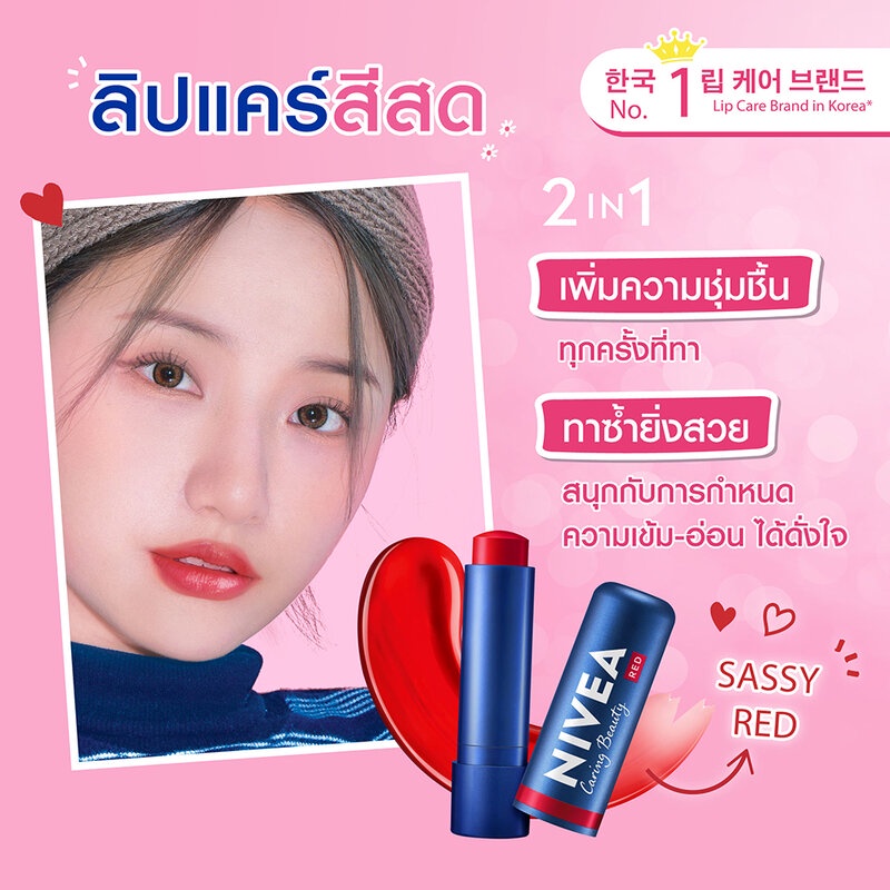 NIVEA Lip Caring Color 4.8g #Redผลิตภัณฑ์บำรุงริมฝีปาก ใช้ได้ทุกวัน สีสดใส ชุ่มชื้น เติมสีเข้ม-อ่อน ได้ดั่งใจ มอบสีชัดปากฉ่ำ ทาซ้ำยิ่งสวย• ริมฝีปากชุ่มชื้น ตามแบบฉบับของนีเวียลิปแคร์ สูตรผสาน Shea butter, Organic Almond Oil และ Vitamin E ที่ช่วยเพิ่มความชุ่มชื้นให้ปากในทุกครั้งที่ทา