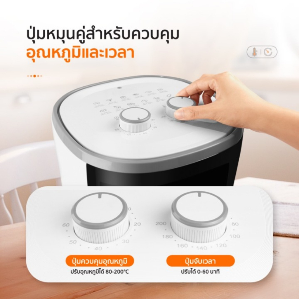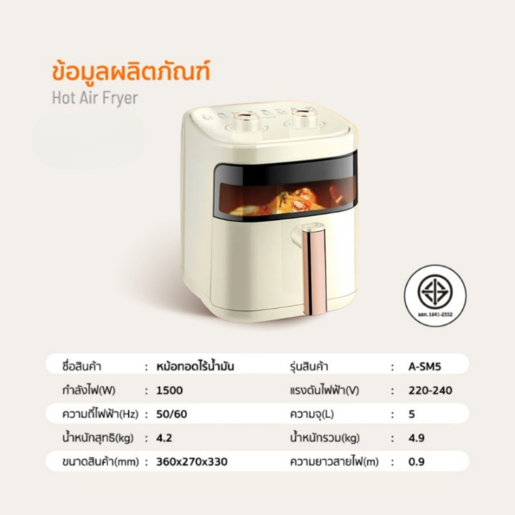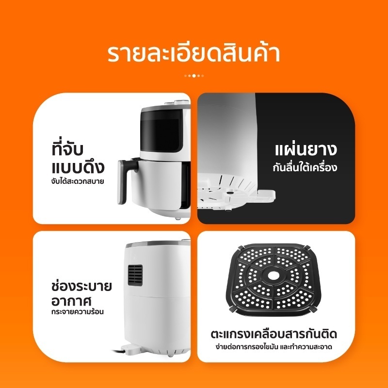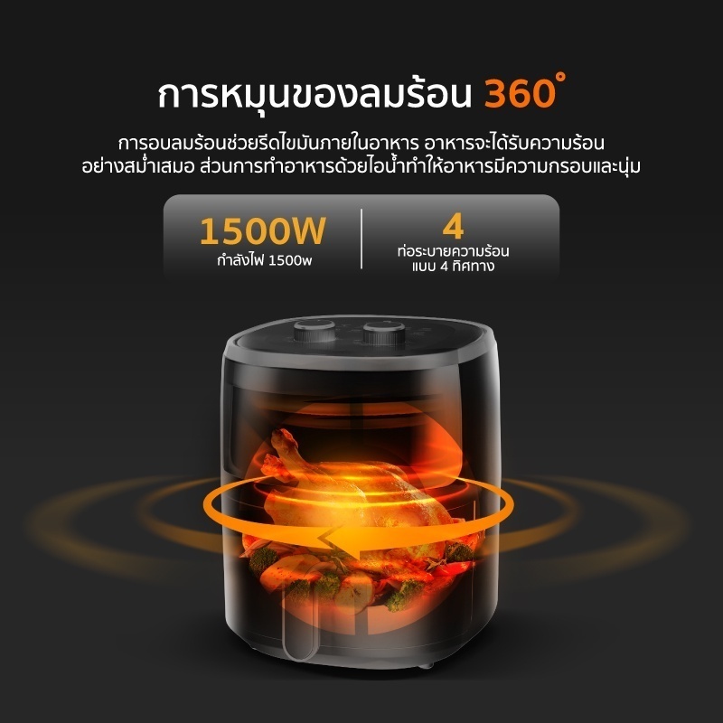 ทางเลือกเพื่อสุขภาพสำหรับเมนูทอด ปิ้ง ย่าง และอบอาหารแบบไร้น้ำมัน ใช้งานง่ายและปลอดภัย ด้วยเทคโนโลยีไหลเวียนลมร้อน 360° ด้วยความร้อนที่คงที่และสม่ำเสมอ หม้อจะทำความร้อนอย่างทั่วถึงและปราศจากน้ำมัน หม้อทอดขนาดใหญ่ ความจุ 5 ลิตร ตัวหม้อเคลือสาร Non-Stick มาพร้อมกับตะแกรงด้านใน สามารถถอดออกได้ ง่ายต่อการทำความสะอาด ปุ่มปรับอุณหภูมิความร้อนแบบหมุน ตั้งเวลาได้สูงสุด 60 นาที ปรับเลือกอุณหภูมิที่ต้องการได้ตั้งแต่ 80°C - 200°C ใช้งานง่าย มีไฟแสดงสถานะการทำงานและระบบตัดไฟอัตโนมัติเมื่อครบเวลา