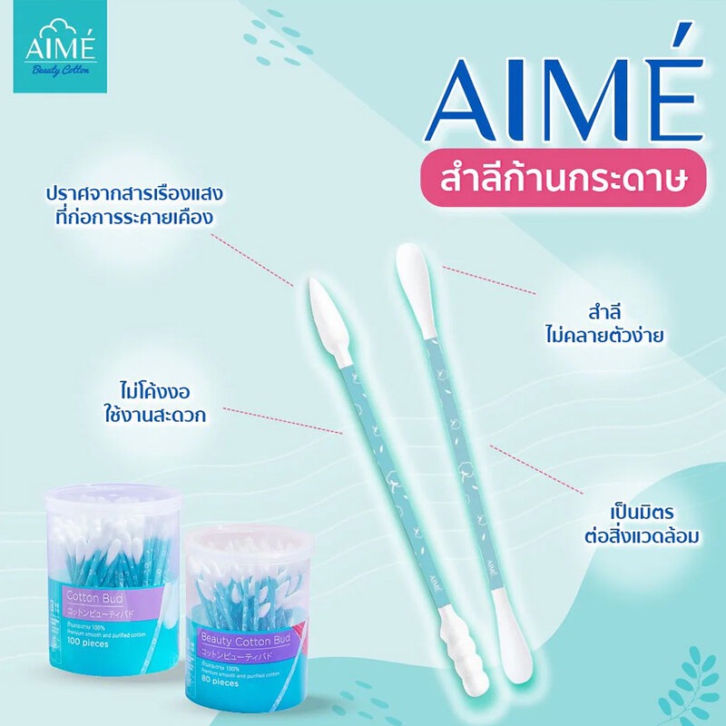 Cr. facebook.com/AIMEBeautyAime Beauty Cotton Bud 80pcs สำลีพันก้านหัวแหลม สำหรับการเช็ดทำความสะอาดในจุดละเอียดเพื่อให้มั่นใจว่าไร้สิ่งสกปรกตกค้างบนใบหน้า แล้วยังเป็นตัวช่วยในการแต่งหน้าได้อีกด้วย ผลิตจากก้านกระดาษและใยฝ้ายธรรมชาติ 100% ผ่านการฆ่าเชื้อด้วยความร้อน ปราศจากสารเรืองแสง และ ด้วยคุณภาพก้านกระดาษ (Paper Stem) ทำให้สำลียึดติดกับก้านไม่คลายตัวง่าย ไม่โค้งงอ ไม่หักง่ายขณะใช้ ย่อยสลายง่าย เป็นมิตรกับสิ่งแวดล้อม