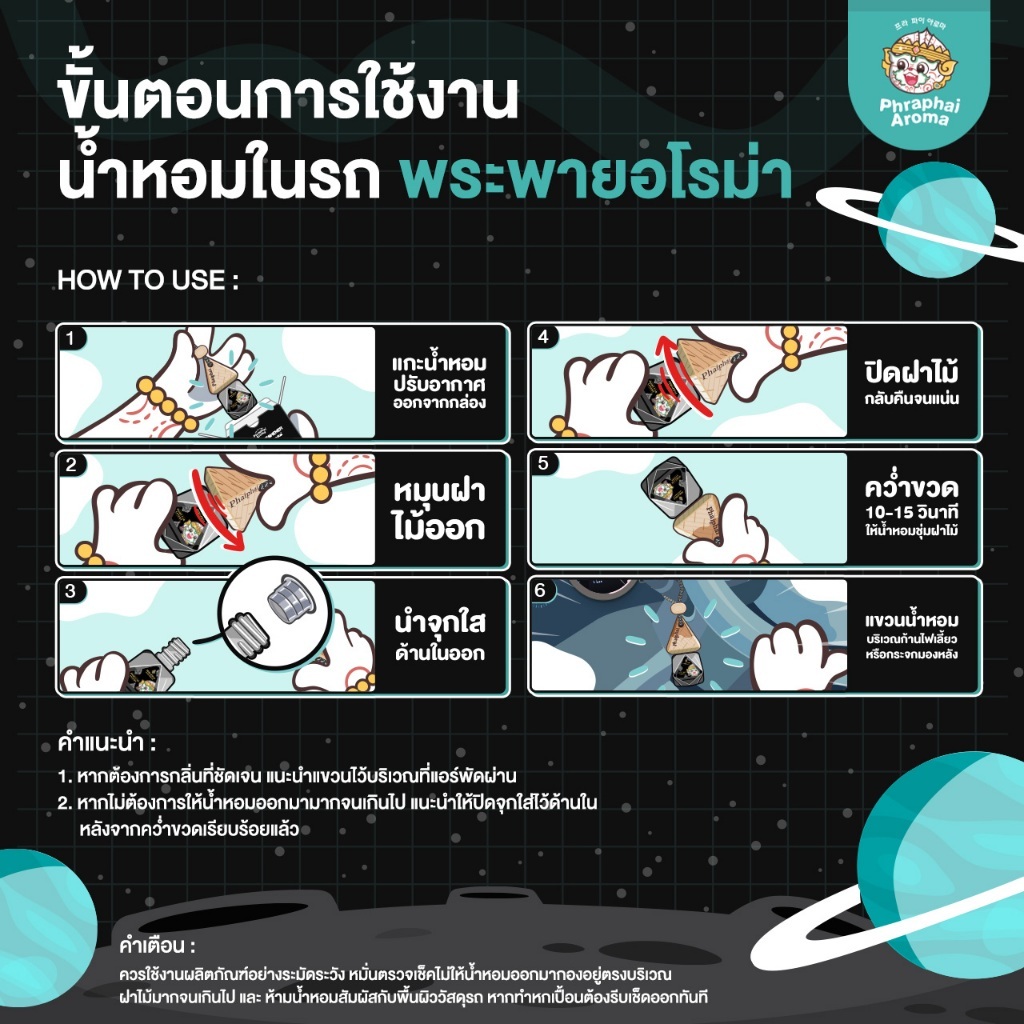 วิธีใช้ หมุนฝาไม้ออก จากนั้นดึงจุกใสด้านในออก นำฝาไม้หมุนกลับให้แน่น คว่ำขวดเล็กน้อย พอให้น้ำหอมสามารถระเหยออกจากฝาไม้ได้ (กลิ่นจะกระจายผ่านฝาไม้)