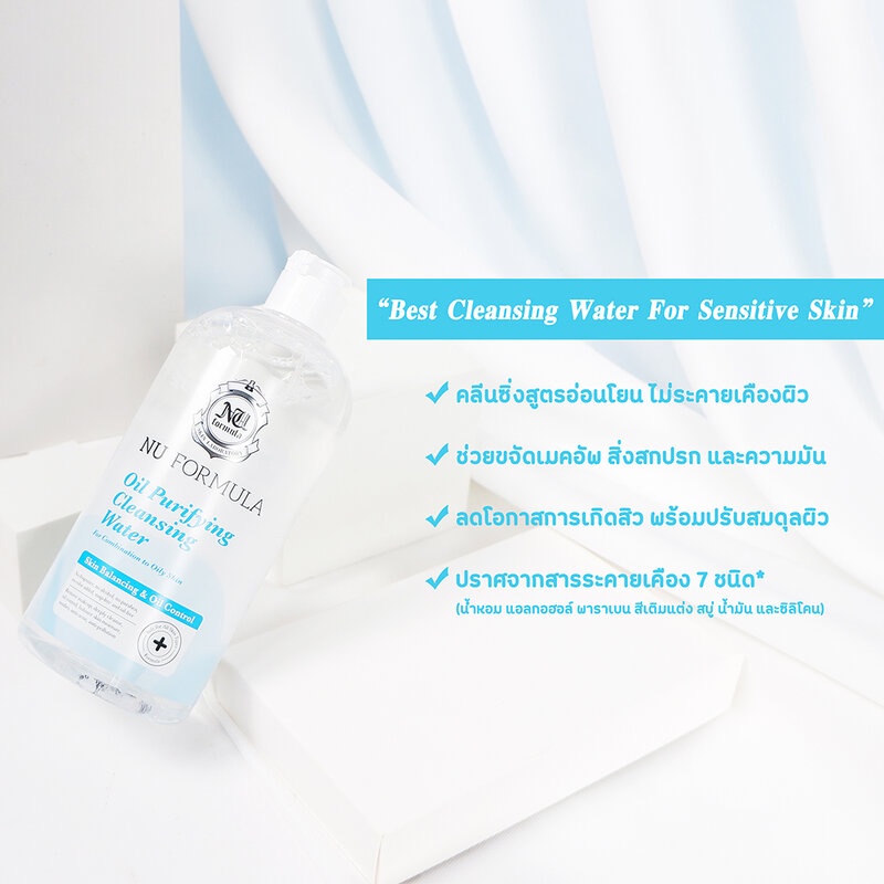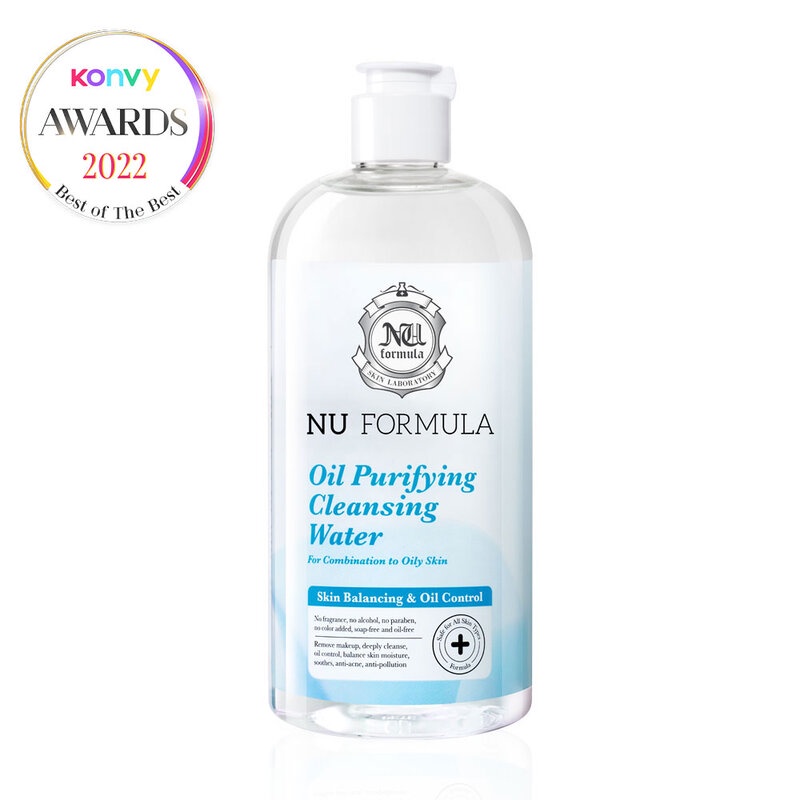 Nu Formula Oil Purifying Cleansing Water 510mlตัดจบทุกวงจรสิว! ด้วยคลีนซิ่งไมเซลล่า สำหรับผิวผสม-ผิวมัน จากนู ฟอร์มูล่า ด้วยอนุภาคไมเซลล่าธรรมชาติขจัดสิ่งอุดตันและความมันได้อย่างล้ำลึกกว่าโดยไม่ทิ้งความมันตกค้าง ทำความสะอาดโดยไม่ทำลายสารเคลือบผิวธรรมชาติ พร้อมเติมความชุ่มชื้นด้วย Hyaluron ทำให้ผิวไม่แห้งตึง มี Zinc PCA ช่วยควบคุมความมัน ตัดวงจรสิวซ้ำซาก พร้อมรับการบำรุงผิวในขั้นต่อไปได้อย่างเต็มที่ ใช้ต่อเนื่องรู้สึกสิวน้อยลงคุณสมบัติโดดเด่น