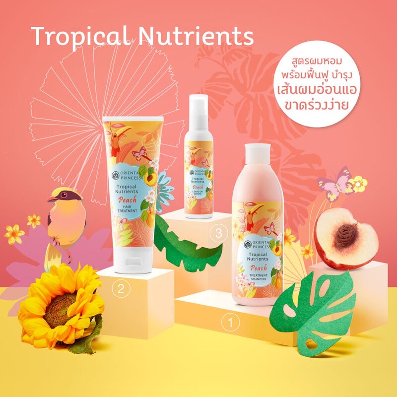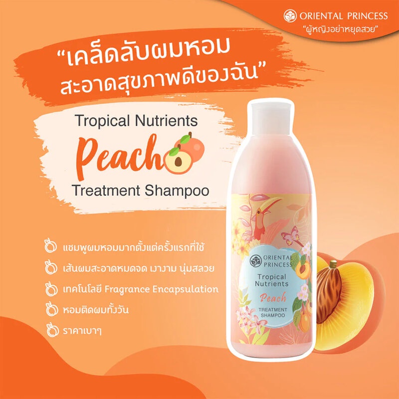 Cr.orientalprincess.comOriental Princess Tropical Nutrients Peach Treatment Shampoo 250ml แชมพูเพื่อผมอ่อนแอขาดหลุดร่วงง่าย ช่วยทำความสะอาดเส้นผมอย่างอ่อนโยน พร้อมคงเสน่ห์ผมหอม ด้วยนวัตกรรม Encapsulation Technology ที่ปลดปล่อยความหอมให้ฟุ้งกระจายทุกครั้งที่สะบัดผม ให้ผมหอมยาวนาน 24 ชั่วโมง ผสานคุณค่าการบำรุงจาก Nutri Moist และ Peach Extract