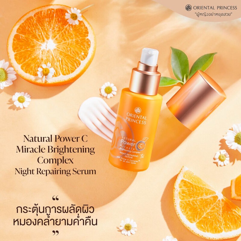 Oriental Princess Natural Power C Miracle Brightening Complex Night Repairing Serum 60mlเซรั่มบำรุงผิว ปรนนิบัติดูแลผิวให้กระจ่างใส เรียบเนียนพร้อมกระตุ้นการผลัดผิวตามธรรมชาติ พร้อมปกป้องความชุ่มชื่นผิวตามธรรมชาติ เผยผิวเนียนนุ่ม ไม่แห้งตึง