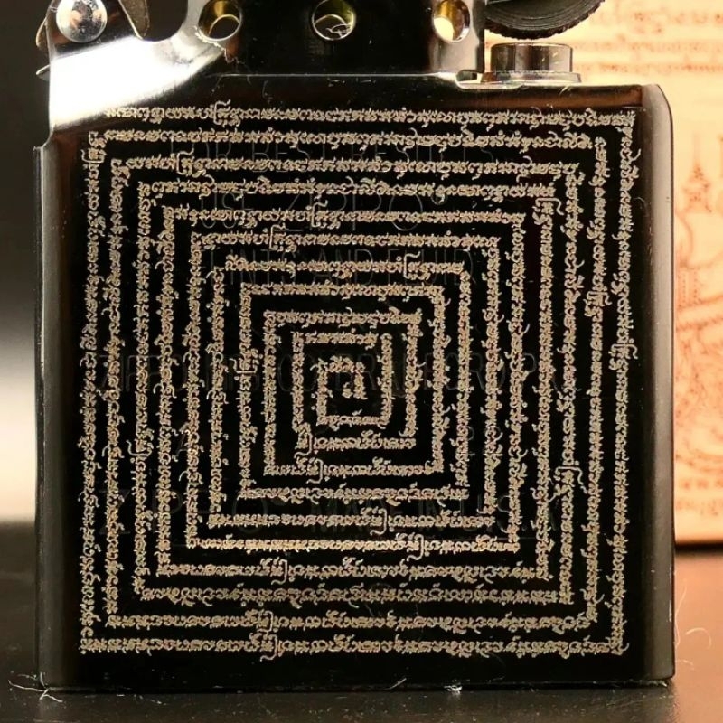🔥อักขระขอมโบราณด้านหน้าของตัวถังด้านในเขียนด้วยลายมือของอาจารย์อ้น จิวแป๊ะทง มือหนึ่งของประเทศไทยในการออกแบบให้ตัวหนังสือวนตามเข็มนาฬิกาติดต่อกัน 19 จบ เหมือนมองปิรามิดจากด้านบน ส่วนด้านหลังเป็นคาถาบูชาครุฑอีก 1 จบทรงปิรามิด