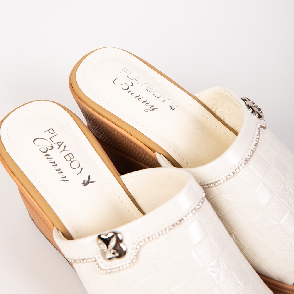 Giày đế bằng da thật Playboy Giày đế bằng thiết kế gót màu trơn với logo Dây chuyền nhựa màu ngọc lam 2 màu, màu kem và màu đen