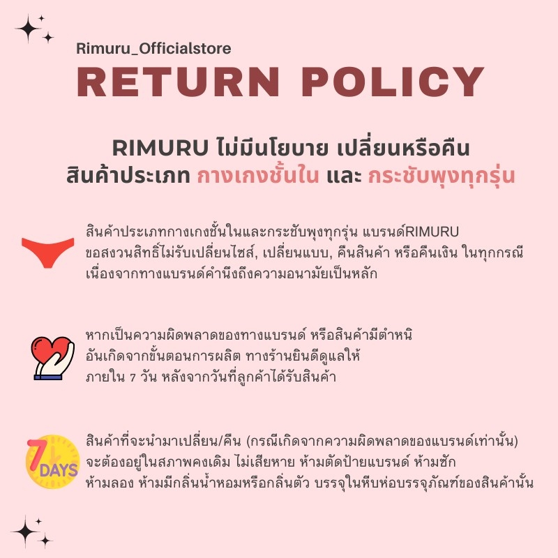 🛑สินค้าประเภทกางเกงชั้นใน กางเกงซับในกันโป๊ และกางเกงกระชับพุง (ที่ใช้กับจุดซ่อนเร้น) แบรนด์ RIMURU ขอสงวนสิทธิ์ไม่รับเปลี่ยน/คืน ในทุกกรณี🛑
