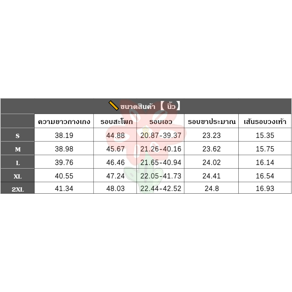 S สะโพก 41.73 เอว 20.87-39.37 รอบขาประมาณ 23.23 เส้นรอบวงเท้า 19.29 ความยาวกางเกง 38.98