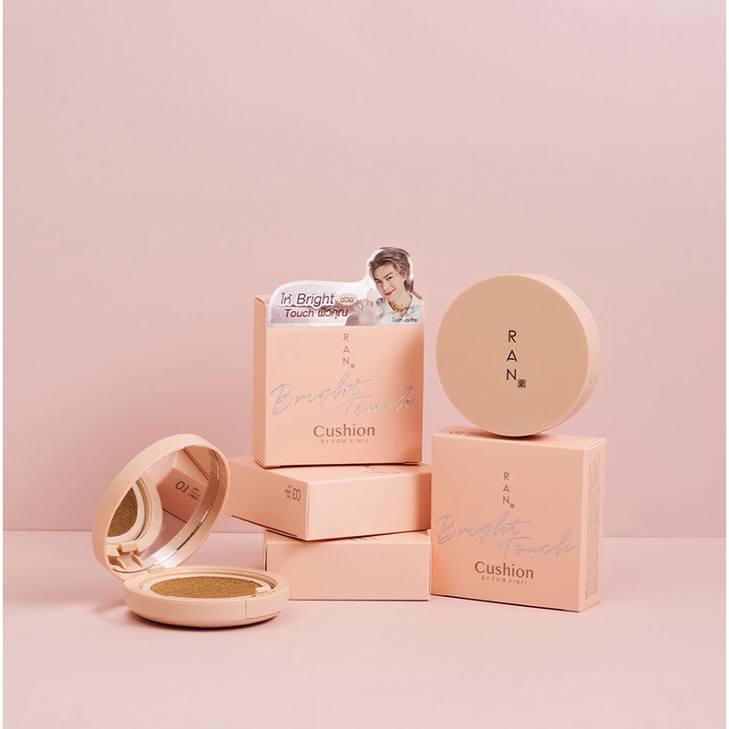 Cr. facebook.com/RancosmeticofficialRAN COSMETIC Bright Touch Cushion By Pom Vinij 15g #01 Light ทัชหน้าเมื่อไหร่ ก็ทัชใจทุกครั้ง อวดผิวสวยเปล่งประกายสดใสทั้งวันกับคุชชั่นรัน ช่วยควบคุมความมัน เบลอรูขุมขนและปกปิดจุดด่างดำดีเยี่ยมในระดับ Full Coverage แต่ยังคงเบาสบายผิวด้วยนวัตกรรมใหม่ Soft Air Cover เนื้อคุชชั่นนุ่มลื่นต่างจากคุชชั่นทั่วไปที่เคยมี โดยเมื่อสัมผัสผิวจะกลายเป็นแป้ง ทั้งยังบำรุงผิวด้วย Tri-HYA ไฮยาลูรอน 3 ชนิดในขนาดต่างกันจากเกาหลี ทำหน้าที่ได้ครอบคลุม ทั้งเติมความชุ่มชื้นให้ผิวฉ่ำน้ำนุ่มฟู พร้อมเคลือบชั้นผิว ล็อคเม็ดสีให้ติดทน อีกทั้งมี PM Protector ช่วยป้องกันผิวจากมลภาวะต่างๆ รวมถึงฝุ่นละอองขนาดเล็ก ดูแลผิวให้สวยทั้งภายนอกและภายใน เหมือนมีไบร์ทมาดูแลคุณ