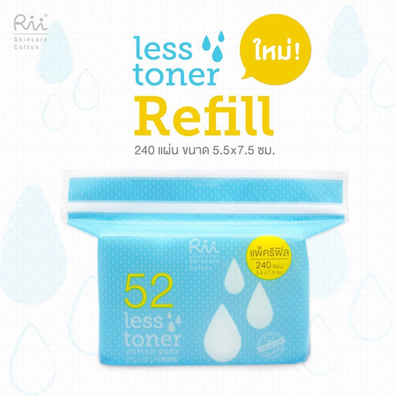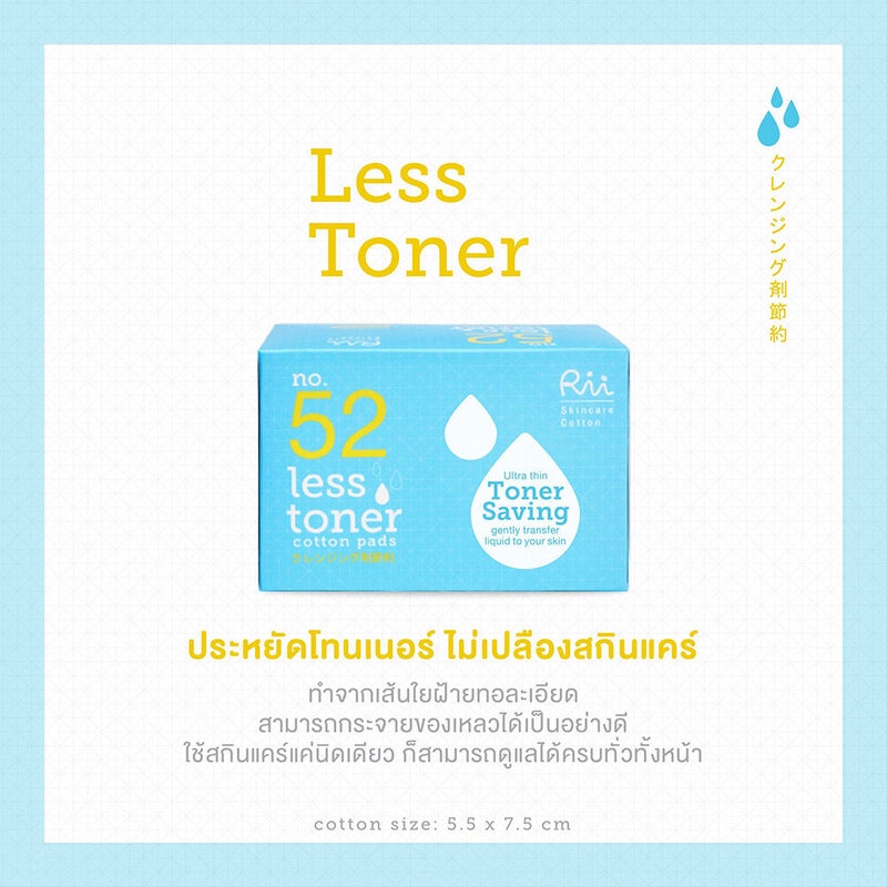 Cr : Facebook.com/riicottonRii 52 Less Toner Cotton Pads 240pcs (Refill) สำลีแผ่นสำหรับโทนเนอร์ บางแต่นุ่ม ผลิตจากฝ้ายคุณภาพสูง Cotton USA ฝ้ายใยยาวดุจเส้นไหม ด้วยเทคโนโลยี Aqua Care เทคโนโลยีที่ใช้ความอ่อนโยนของน้ำถักทอเส้นใยฝ้าย เพื่อให้ได้สำลีที่สะอาด บริสุทธิ์ ไม่ใช้สารเคลือบผิว สามารถซึมซับของเหลวและส่งผ่านเข้าสู่ผิวได้อย่างดีเยี่ยม อีกทั้งยังมีขนาดเหมาะสมกับการใช้งานและไม่มีส่วนผสมที่ก่อให้เกิดการระคายเคือง