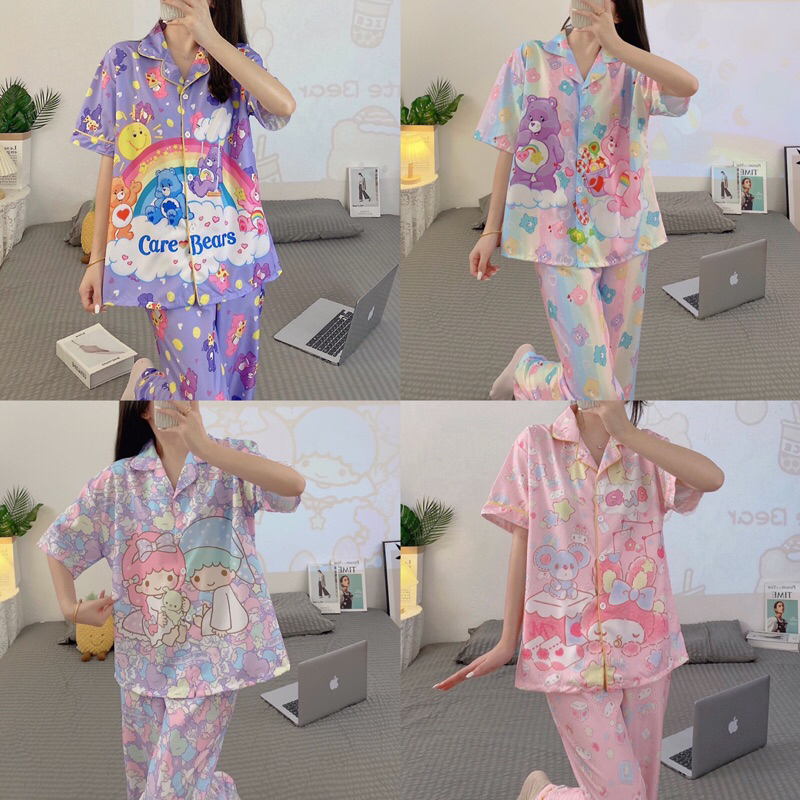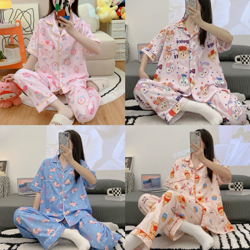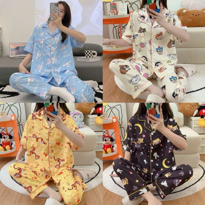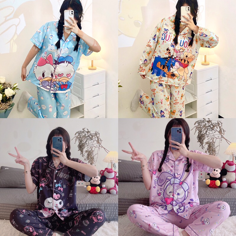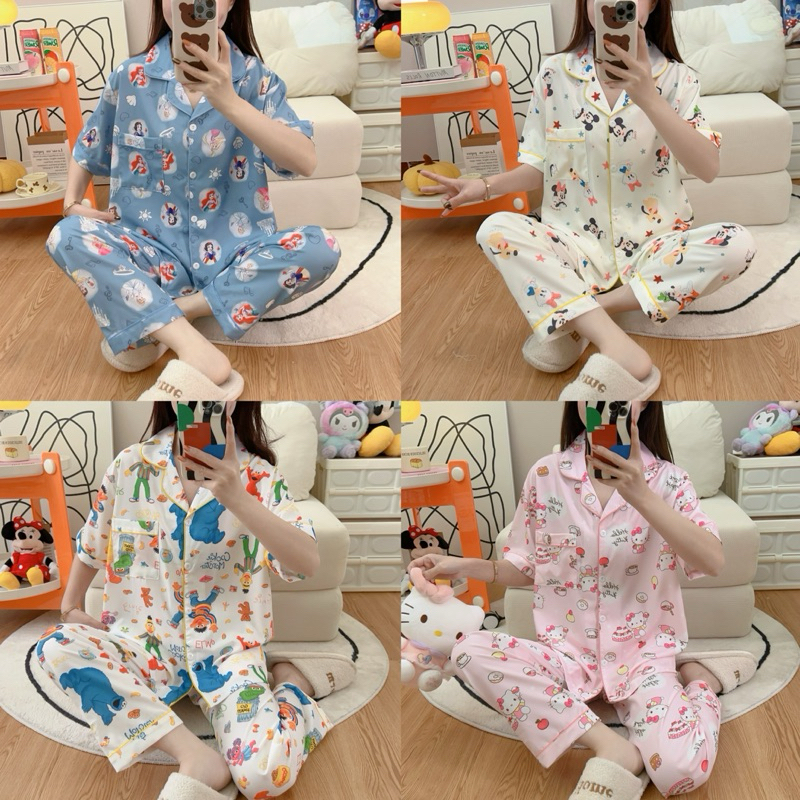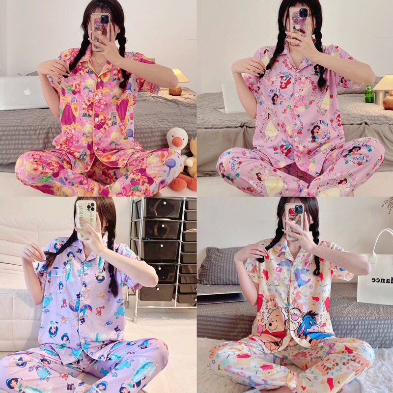 🎀Sẵn sàng giao hàng bộ đồ ngủ lụa ý tay ngắn họa tiết hoạt hình cổ áo trước rất mềm