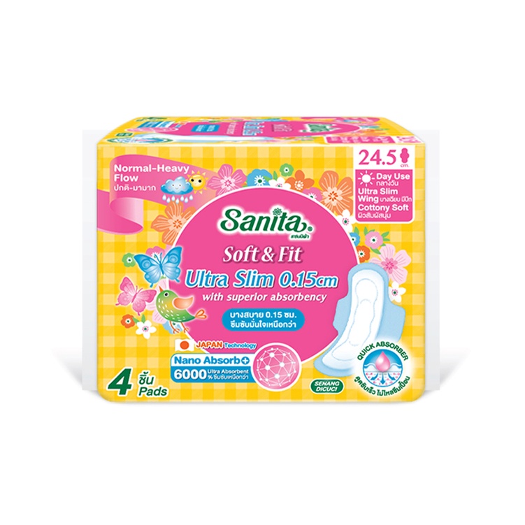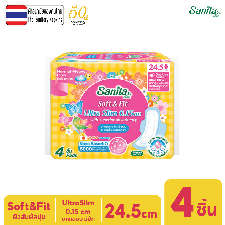 #Sanita / #แซนนิต้า #ซอฟท์ แอนด์ ฟิต #ผิวสัมผัสนุ่ม #อัลตร้าสลิม บาง0.15ซม #มีปีก ยาว24.5ซม. 4ชิ้น/ห่อ#ผ้าอนามัยผิวสัมผัสนุ่ม #เหมาะสำหรับผิวแพ้ง่าย ยาว 24.5ซม. สำหรับกลางวัน (มาปกติ - มามาก)