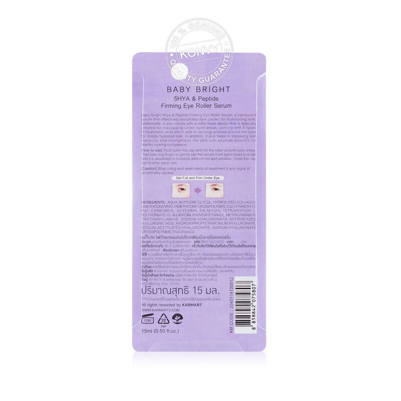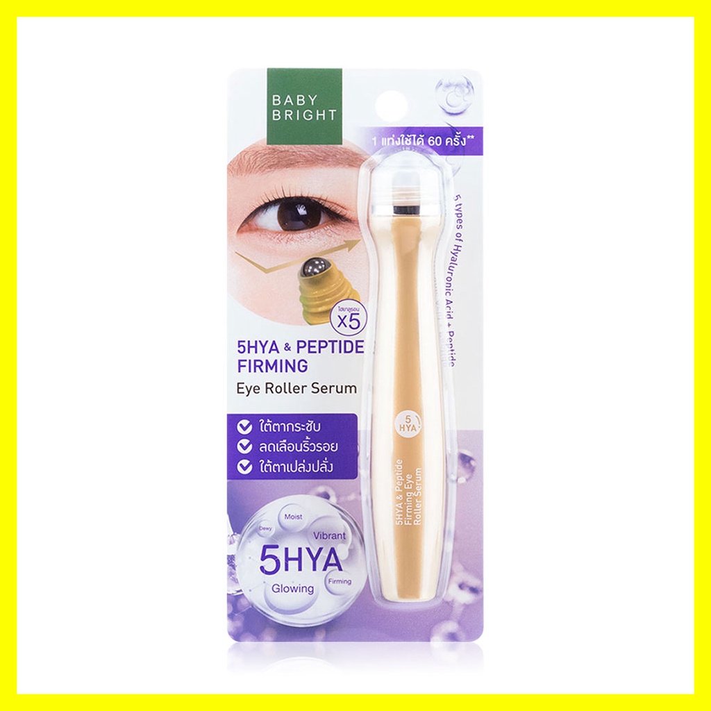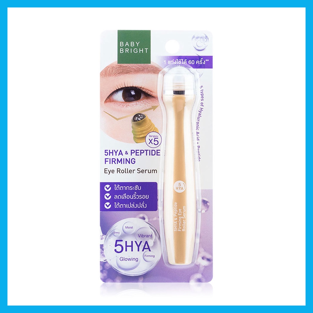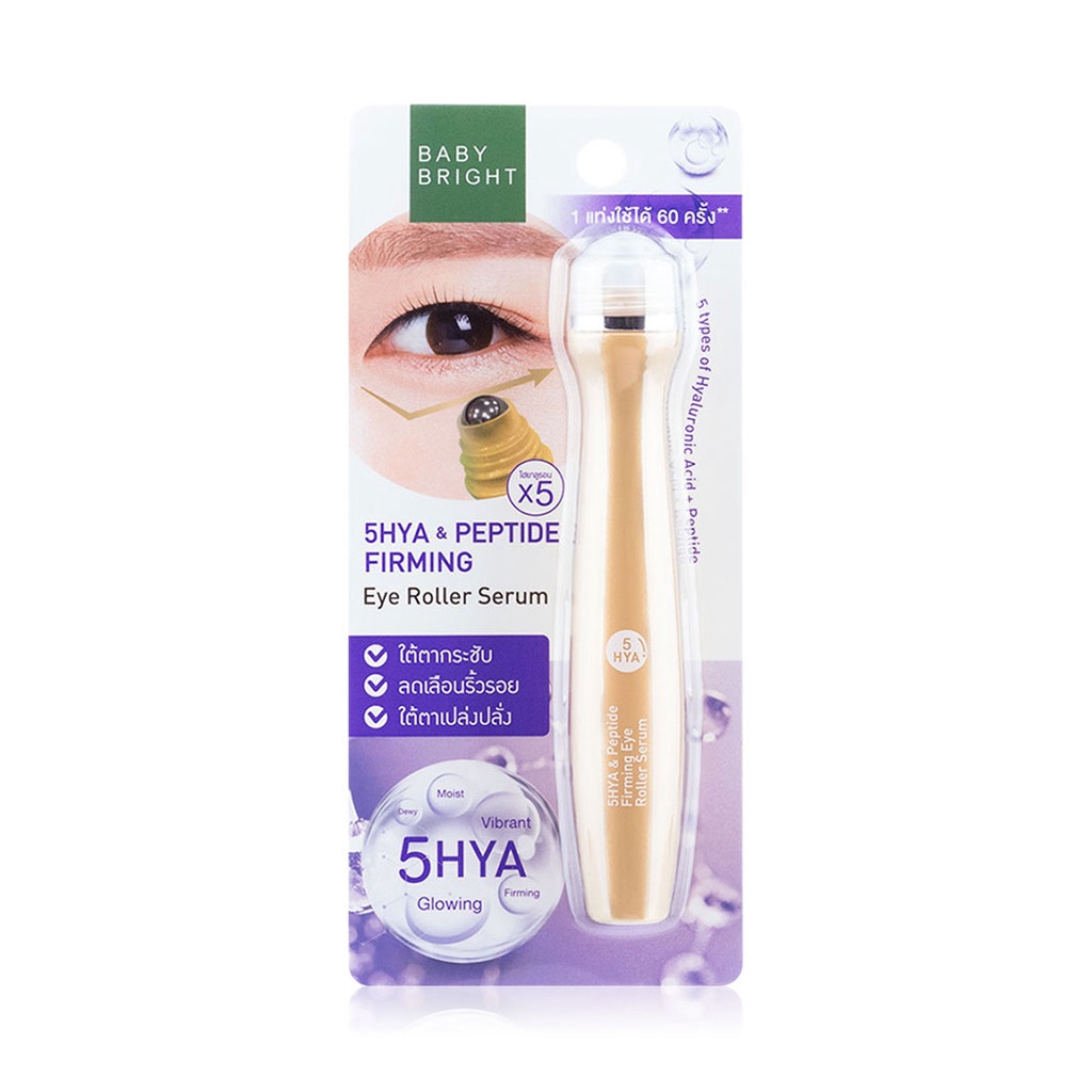 Baby Bright 5Hya & Peptide Firming Eye Roller Serum 15ml อายโรลเลอร์เซรั่ม เนื้อเซรั่มใส ที่สุดแห่งการดูแลผิวรอบดวงตาเป็นพิเศษ กับลูกกลิ้งที่ออกแบบมาสำหรับนวดรอบดวงตาโดยเฉพาะ พร้อม Hyaluron 5 ชนิด ตรงเข้าบำรุงผิวรอบดวงตาให้ชุ่มชื่นมากเป็นพิเศษ ผิวแข็งแรงขึ้น ผสานเปปไทด์เพิ่มความยืดหยุ่นรอบดวงตา รู้สึกกระชับ เต่งตึง พร้อมลดเลือนริ้วรอยบริเวณรอบดวงตาให้ดูสดใสและสุขภาพดี•ผิวเนียนกระชับ