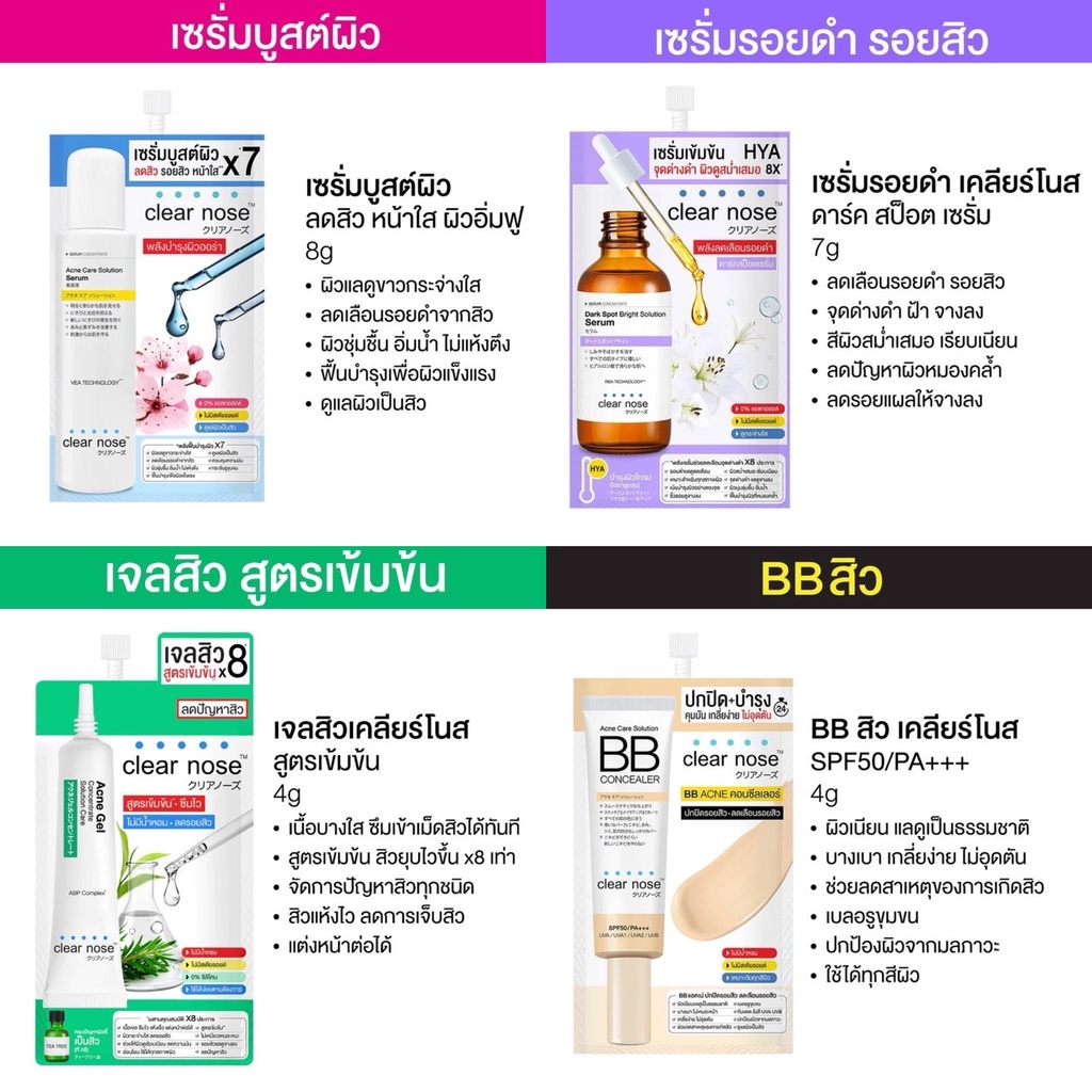 เคลียร์โนส แอคเน่ แคร์ โซลูชั่น บีบี คอนซีลเลอร์ ปกปิดรอยสิว เนื้อสัมผัสบางเบา แต่ปกปิดได้ดี ให้ผิวสวยเป็นธรรมชาติ ลดปัญหาสิว ช่วยป้องกันการเกิดสิวใหม่ ลดความเครียดสะสมในผิวซึ่งเป็นสาเหตุของสิว ผิวแพ้ง่ายและริ้วรอย บีบีครีมเนื้อนุ่ม เกลี่ยง่าย ไม่ระคายเคืองผิว ไม่อุดตัน พร้อมช่วยปรับสีผิวให้เรียบเนียนสม่ำเสมอ และเทคโนโลยี Hybrid Sunscreen ป้องกันแสงแดด SPF50 PA+++UVA1,UVA2 และ UVB
