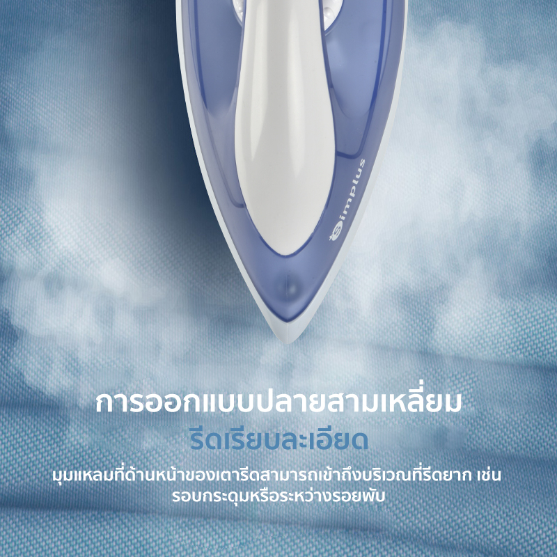 ● การออกแบบปลายสามเหลี่ยม, รีดเรียบละเอียด, มุมแหลมที่ด้านหน้าของเตารีดสามารถเข้าถึงบริเวณที่รีดยาก เช่น รอบกระดุมหรือระหว่างรอยพับ
