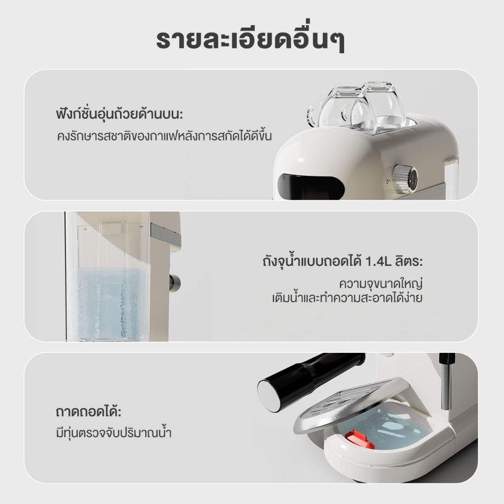 7. อื่นๆ: ถังจุน้ำแบบถอดได้ 1.4 ลิตร ฟังก์ชั่นอุ่นถ้วยด้านบน , ถาดถอดได้ ชามผงกาแฟแบบสปริง