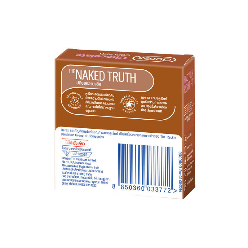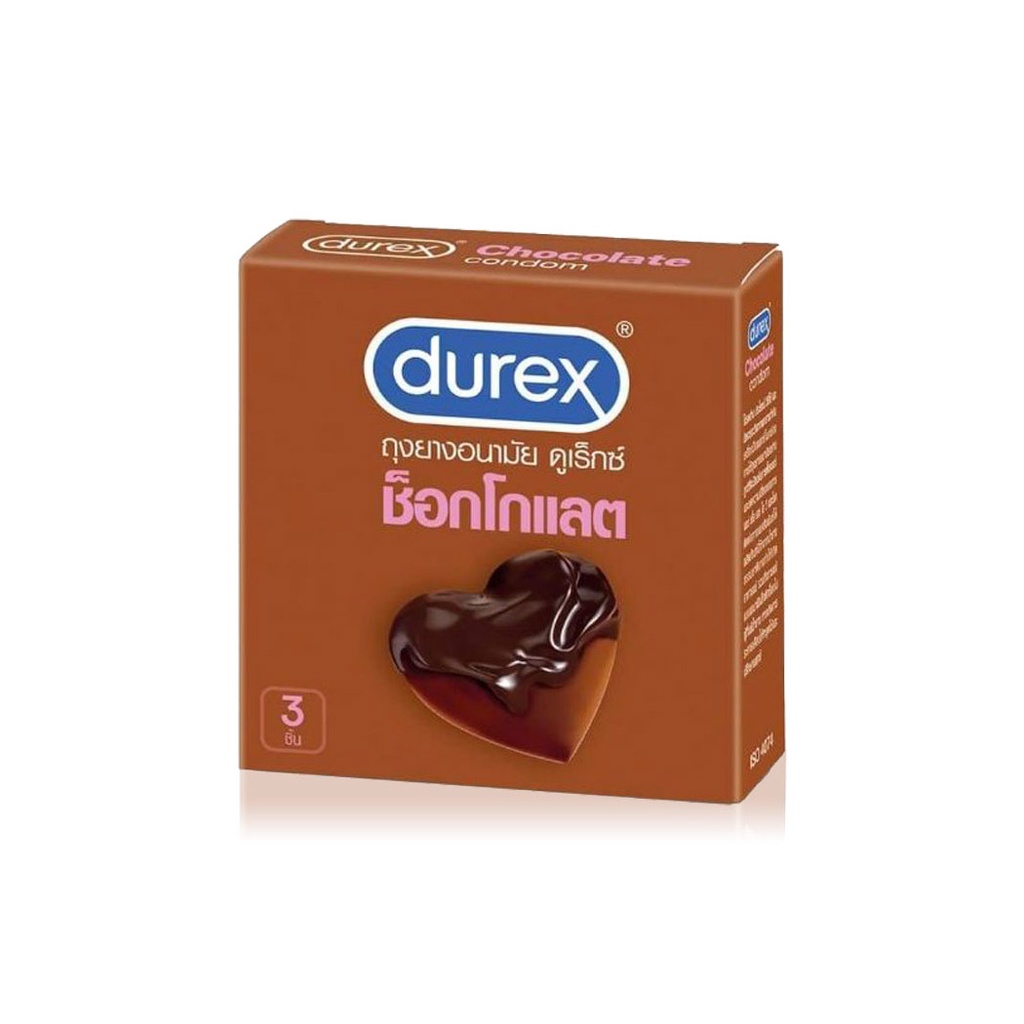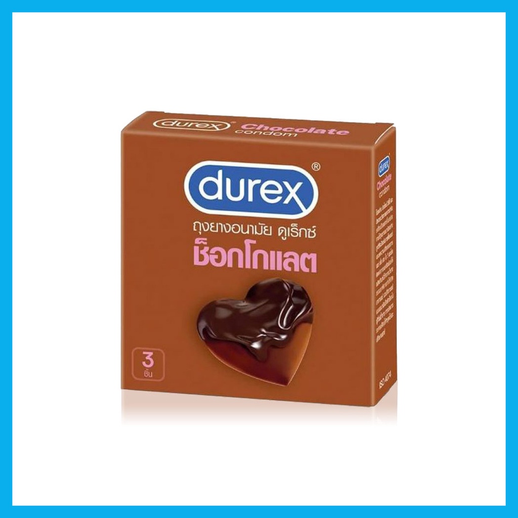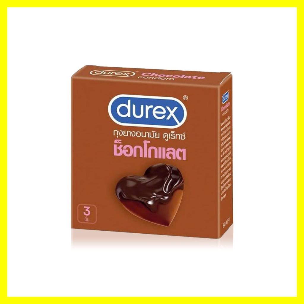 Cr.facebook.com/DurexThailandDurex Condom Chocolate53mm [3pcs] เติมเต็มความสุขบนเตียงของคุณได้ทุกที่ทุกเวลา กับถุงยางอนามัยขนาด 53 มม. ผิวไม่เรียบ ผนังขนาน มีกระเปาะ มีสารหล่อลื่นกลิ่นช็อกโกแลต ผลิตจากน้ำยางธรรมชาติ เจือสีน้ำตาล