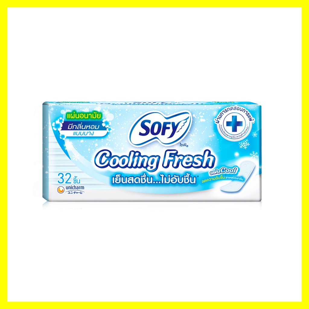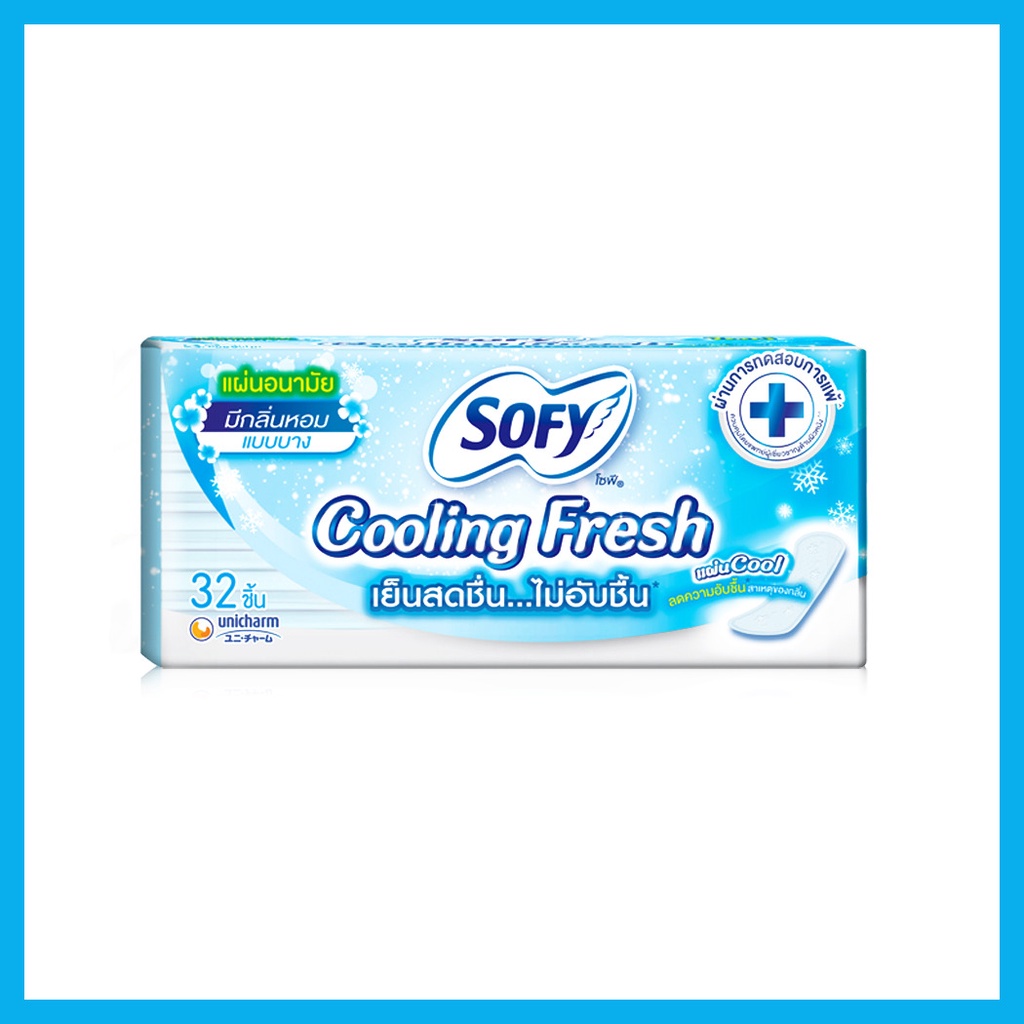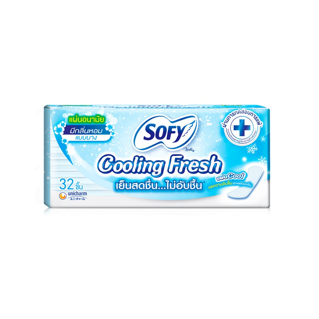 Sofy แผ่นอนามัย Cooling Fresh Silm Scented 32pcsแผ่นอนามัยรุ่นสลิม เย็นสดชื่น ไม่อับชื้น เทคโนโลยีแผ่น Cool ให้ความรู้สึกเย็นสบายตั้งแต่เริ่มใส่ ช่วยลดความอับชื้น สาเหตุของกลิ่น แผ่นบางสบาย เหมือนไม่ได้สวมใส่ให้ทุกวันของคุณรู้สึกเย็นสดชื่น สบายตัวเหมือนเปลี่ยนแผ่นใหม่