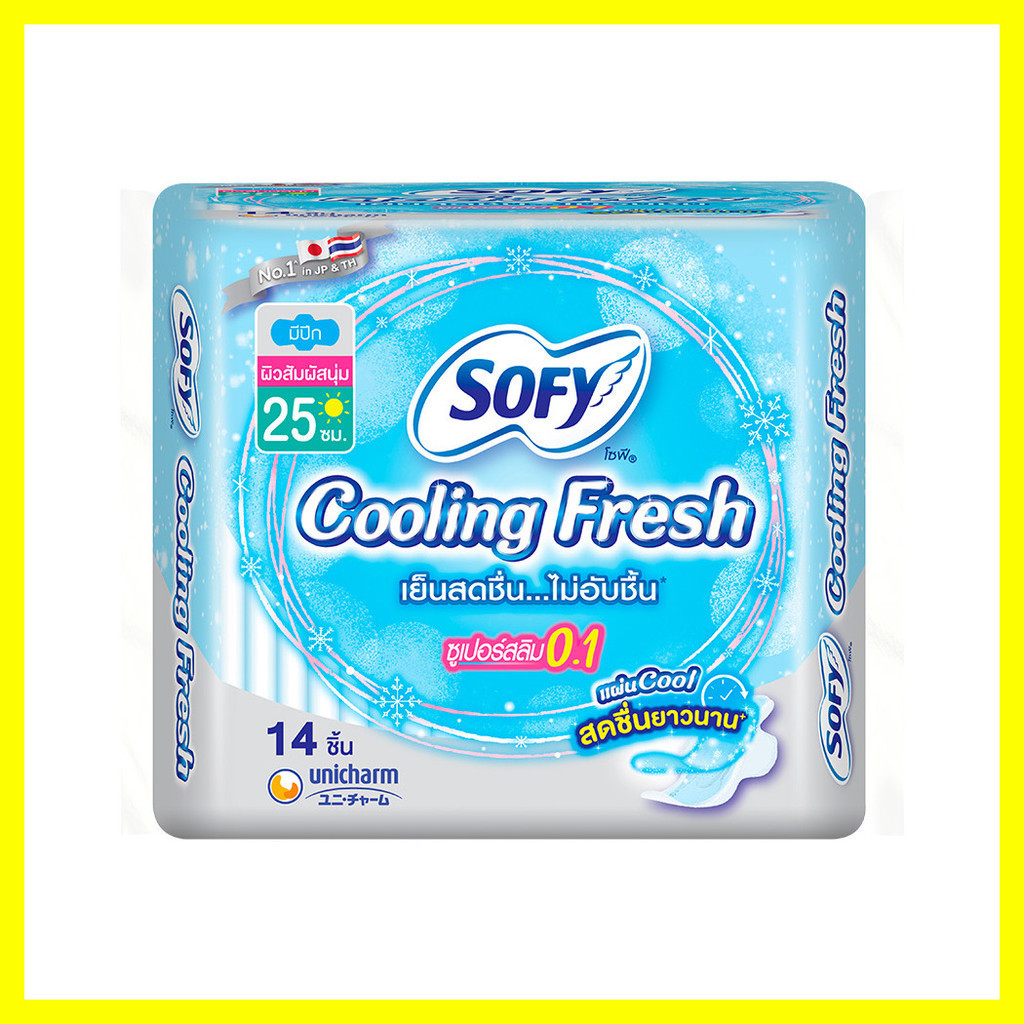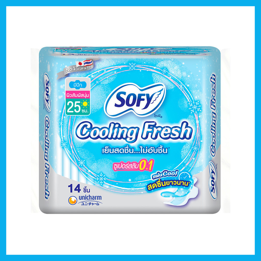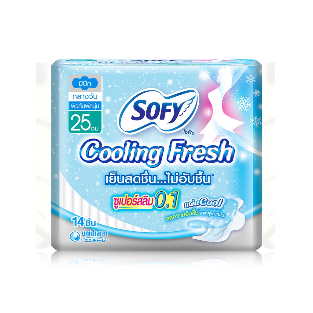 Sofy ผ้าอนามัย Cooling Fresh Super Slim 0.1 Wing [25cm x 14pcs]ผ้าอนามัยสำหรับกลางวัน รุ่นซูเปอร์สลิม 0.1 บางเฉียบเป็นพิเศษ พร้อมความรู้สึกเย็นสดชื่นยาวนาน ด้วยเทคโนโลยีใหม่ “แผ่นคูล” ให้ความรู้สึกเย็นสบายตั้งแต่เริ่มใส่ ช่วยลดความอับชื้น สาเหตุของกลิ่น ยาวนานแค่ไหน ก็สบายตัวเหมือนเปลี่ยนแผ่นใหม่ตลอดวัน• ความยาว 25 ซม. บางเฉียบเป็นพิเศษ แต่ซึมซับดีเยี่ยมยิ่งกว่า มั่นใจทุกการเคลื่อนไหว คล่องตัวได้ทุกสถานการณ์