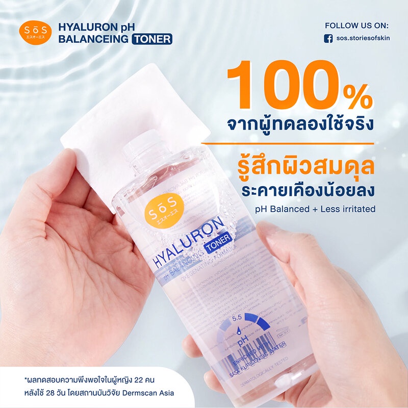 SOS Hyaluron pH Balancing Toner 300ml โทนเนอร์สูตรไฮยาลูรอน อ่อนโยนแม้ผิวบอบบางแพ้ง่าย เข้มข้นบริสุทธิ์ด้วยน้ำไผ่จากญี่ปุ่น ผสาน Purslane สารสกัดจากสาหร่ายทะเลลึก Lactobacillus Ferment และ Beta glucan ช่วยปรับสมดุลผิวที่เสียความชุ่มชื้น และสมดุล pH จากการล้างหน้าและภาวะด่างจากน้ำประปา พร้อมช่วยกำจัดคราบเมคอัพตกค้าง สิ่งสกปรกแม้ขนาด 1 ไมครอน และเซลล์ผิวที่ตายแล้วเพื่อผลัดผิวใหม่ ลดการอุดตันผิว ลดการระคายเคืองลดการเกิดสิว พร้อมเติมออกซิเจนให้แก่ผิวในทันที ผิวจึงชุ่มชื้น สะอาด ไม่แห้งตึง นุ่มน่าสัมผัส และพร้อมรับการบำบัดผิวด้วยมอยเจอร์ไรเซอร์ในขั้นตอนต่อไป• ทำความสะอาดสิ่งสกปรกแม้ขนาด PM1.0