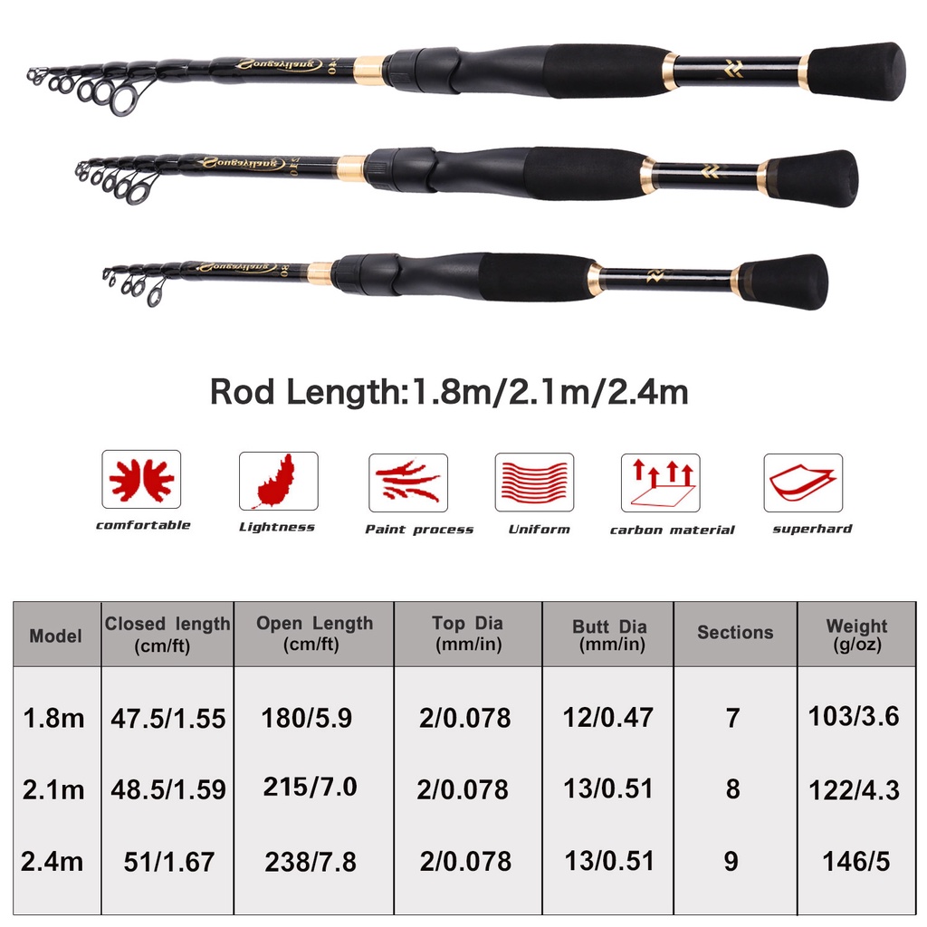 Bộ Cần Câu Cá Cacbon 1.65m 1.8m 2.1m Tỷ số truyền động 7.2:1 2 bộ phận máy Câu Kim Loại Trái phải