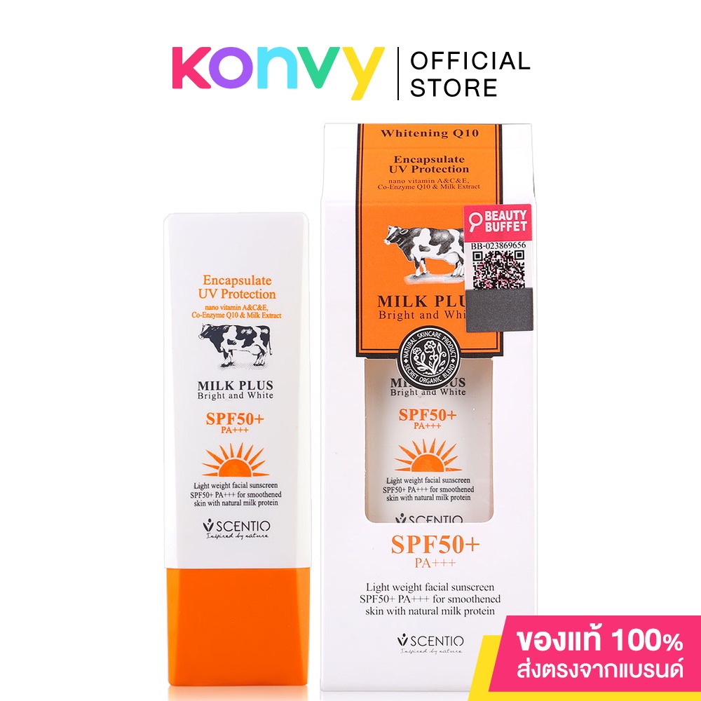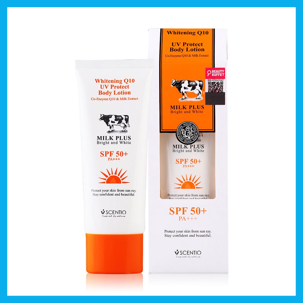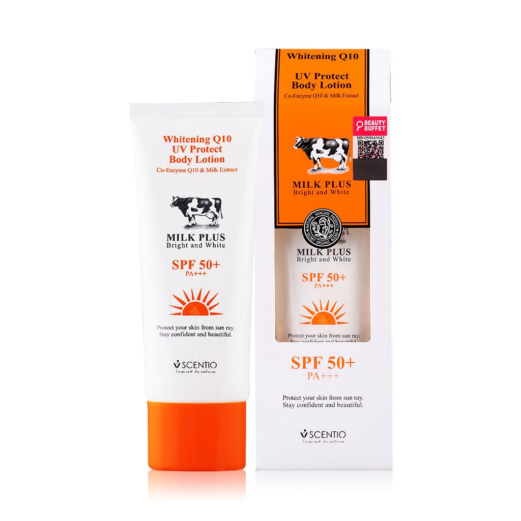 Beauty Buffet Scentio Milk Plus Whitening Q10 UV Protect Body Lotion SPF50+PA++ 100ml ครีมกันแดดสำหรับผิวกาย เนื้อนุ่ม ซึมซาบเร็ว ไม่เหนียวเหนอะหนะ ปกป้องผิวจากรังสียูวีเอและยูวีบี 50 เท่า ด้วยส่วนผสมของ Milk Protein ช่วยให้ผิวนุ่มชุ่มชื่นเรียบเนียน ผสานกับ Nano Q10 และวิตามินอี ช่วยต้านอนุมูลอิสระ สาเหตุของผิวคล้ำเสีย ฝ้า กระ จุดด่างดำ พร้อม Alpha Arbutin มอบผิวกระจ่างสดใส มอบผิวสวยให้คุณกล้าท้าแสงแดดอวดผิวสวยสุขภาพดีได้อย่างมั่นใจ• ครีมกันแดดเนื้อนุ่ม ซึมซาบเร็ว ไม่เหนียวเหนอะหนะ