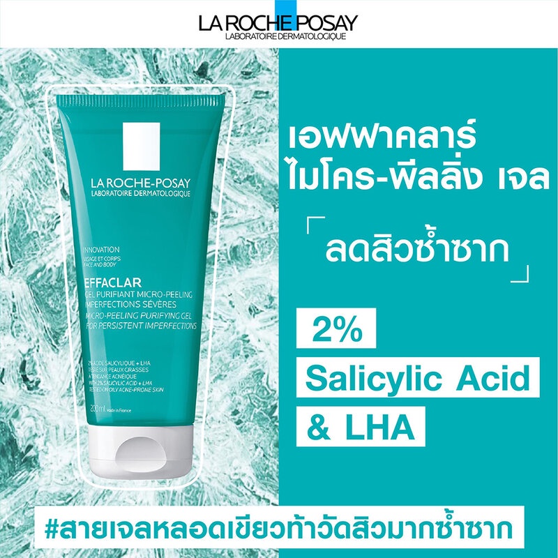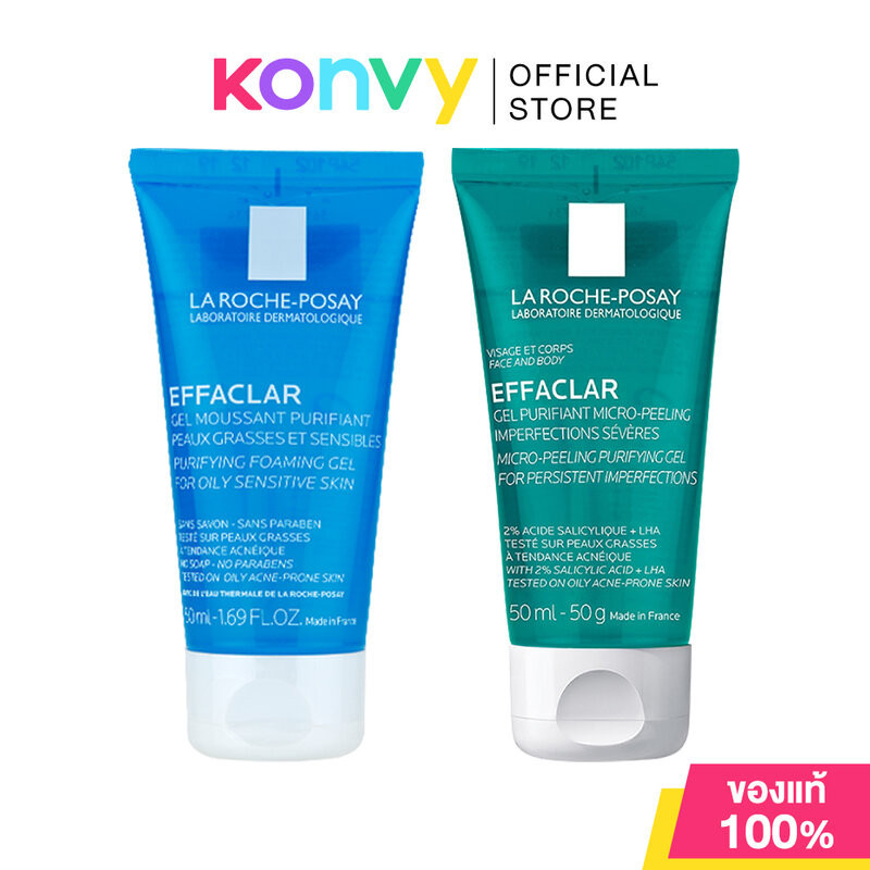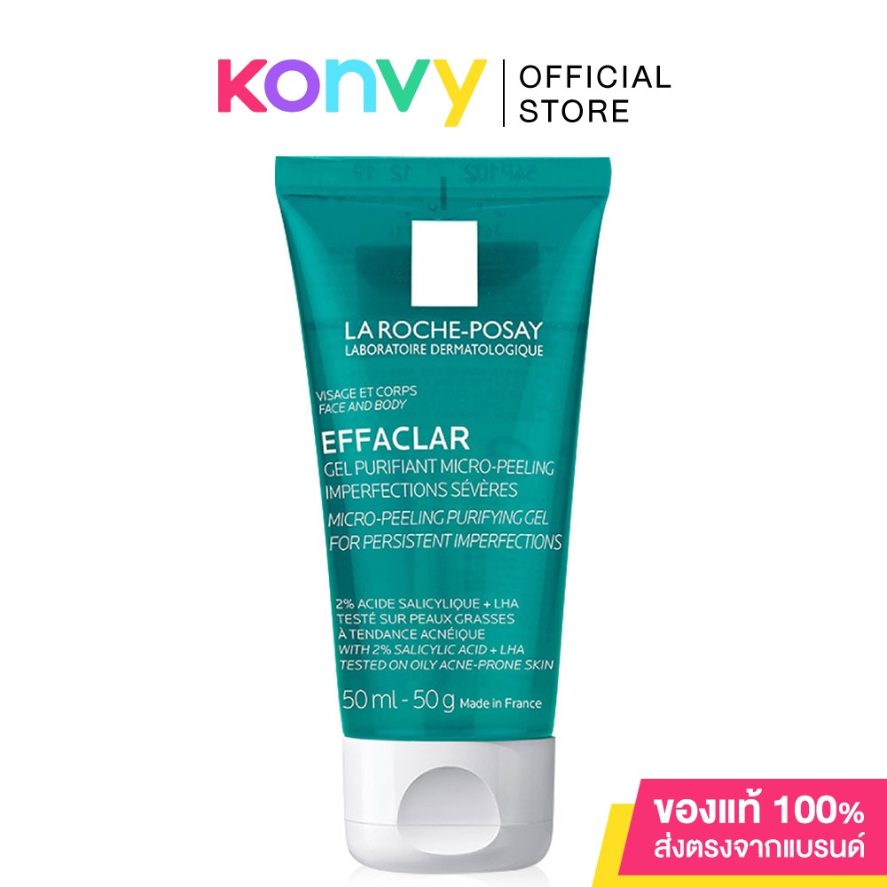 • La Roche Posay Effaclar Micro-Peeling Purifying Gel 50ml เจลทำความสะอาดผิวหน้าและผิวกาย สำหรับผิวมันมีแนวโน้มเป็นสิวง่ายและบอบบาง ผสานส่วนผสมสำคัญ 2% Salicylic Acid และ LHA เพื่อช่วยในการผลัดเซลล์ผิวอย่างอ่อนโยน Zinc ช่วยลดความมันส่วนเกิน และ Glycerin ในการเติมความชุ่มชื้น และช่วยลดความรู้สึกระคายเคือง โดยปราศจากน้ำหอมและแอลกอฮอล์ ผ่านการทดสอบภายใต้การดูแลของแพทย์ผิวหนัง