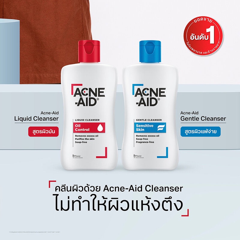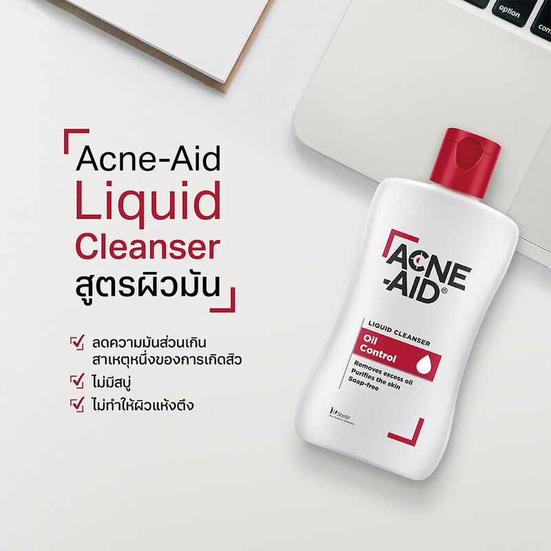 Cr.facebook.com/acneaidthailandACNE-AID Liquid Cleanser 100mlผลิตภัณฑ์ทำความสะอาดผิวหน้า สำหรับผิวมัน เป็นสิวง่าย ลดความมันส่วนเกินและช่วยขจัดสิ่งสกปรกซึ่งเป็นสาเหตุหนึ่งของการเกิดสิว ให้ผิวสะอาดหมดจด อ่อนโยน ไม่ทำให้ผิวแห้งตึง ไม่ระคายเคืองผิว สามารถใช้ได้ทุกวัน ปราศจากสบู่ และมี pH สมดุล