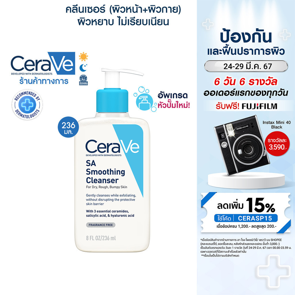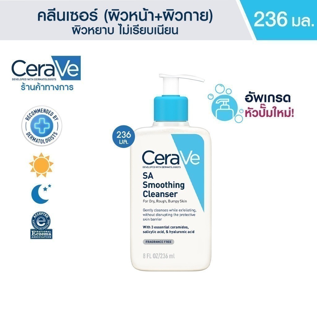 • รายละเอียดผลิตภัณฑ์ / PRODUCT DESCRIPTIONเซราวี เอสเอ สมูทติ้ง คลีนเซอร์ ซึ่งพัฒนาร่วมกับแพทย์ผิวหนัง ผลิตภัณฑ์ทำความสะอาดผิว ขจัดสิ่งสกปรก และความมันส่วนเกินได้อย่างมีประสิทธิภาพ สูตรเฉพาะของเซราวี ด้วยส่วนผสมเซราไมด์ที่จำเป็นต่อผิว เติมความชุ่มชื้น เสริมเกราะปกป้องผิว ผสานซาลิไซลิก แอซิด ช่วยผลัดเซลล์ผิว*อย่างอ่อนโยน สูตรปราศจากไมโครบีดส์ที่อาจจะทำร้ายปราการผิว ไม่ทำให้ผิวแห้งตึง เผยผิวดูนุ่ม สุขภาพผิวดี เรียบเนียนขึ้น สูตรปราศจากน้ำหอม สูตรไม่ก่อให้เกิดการอุดตัน (non-comedogenic) และผ่านการทดสอบบนผิวที่บอบบางมีแนวโน้มระคายเคืองง่าย ภายใต้การควบคุมดูแลของแพทย์ผู้เชี่ยวชาญด้านผิวหนัง• เหตุผลที่คุณจะหลงรัก / WHY YOU WILL LOVE ITผิวดูนุ่ม สุขภาพดี เรียบเนียน