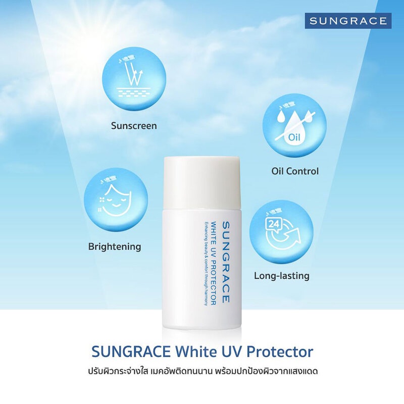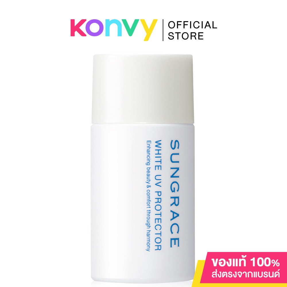 Cr.facebook.com/sungracethailandSUNGRACE White UV Protector SPF42 PA++ 25ml เมคอัพเบสสูตรน้ำนมเนื้อบางเบา เกลี่ยง่าย ช่วยปรับสภาพผิวก่อนการลงรองพื้น มีคุณสมบัติกันน้ำและเหงื่อ ด้วย Moist Soft Focus Powder อนุภาคขนาดเล็กจึงเนียนสนิทไปกับผิว ส่งผลให้เมคอัพติดทนนาน ทั้งยังช่วยปรับสีผิวที่ไม่สม่ำเสมอให้ดูเนียนเรียบ พร้อมปกป้องผิวจากการทำร้ายของรังสี UV โดยไม่ต้องพึ่ง ครีมกันแดด