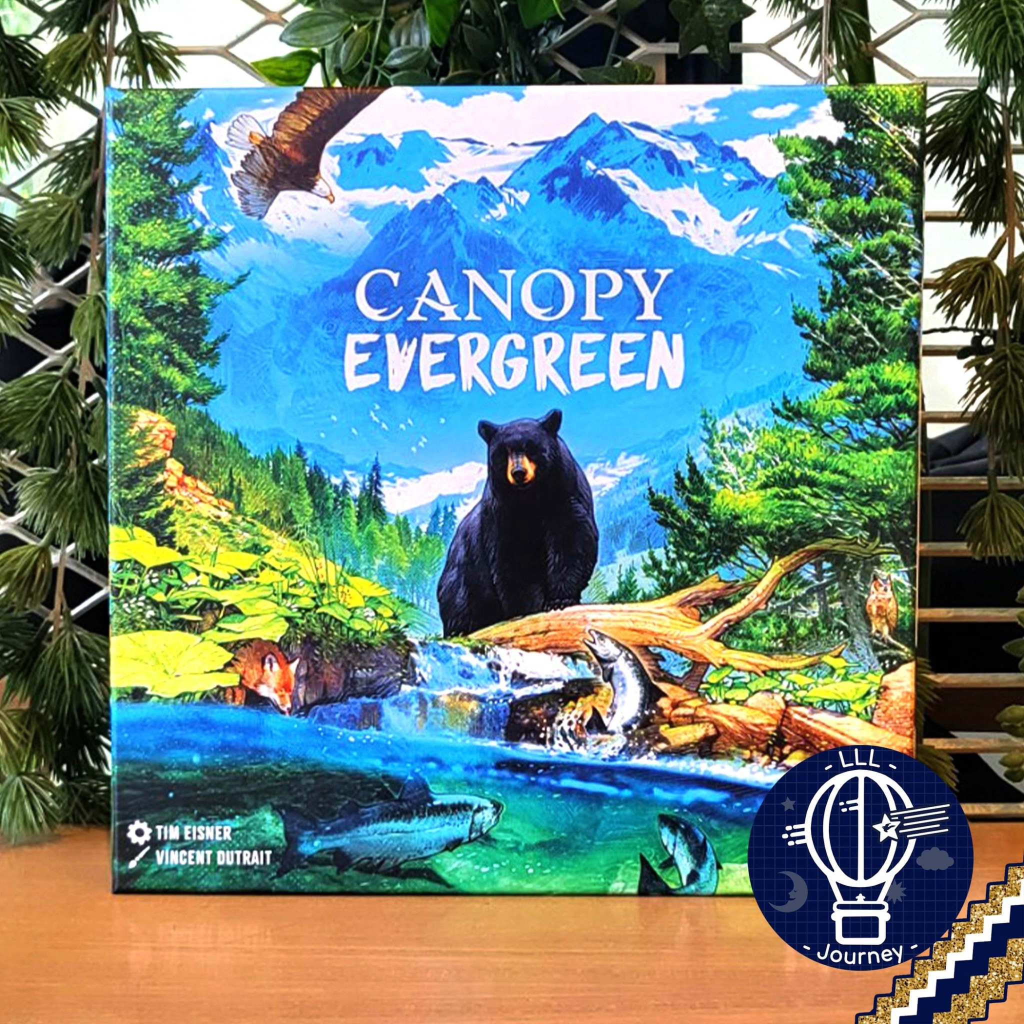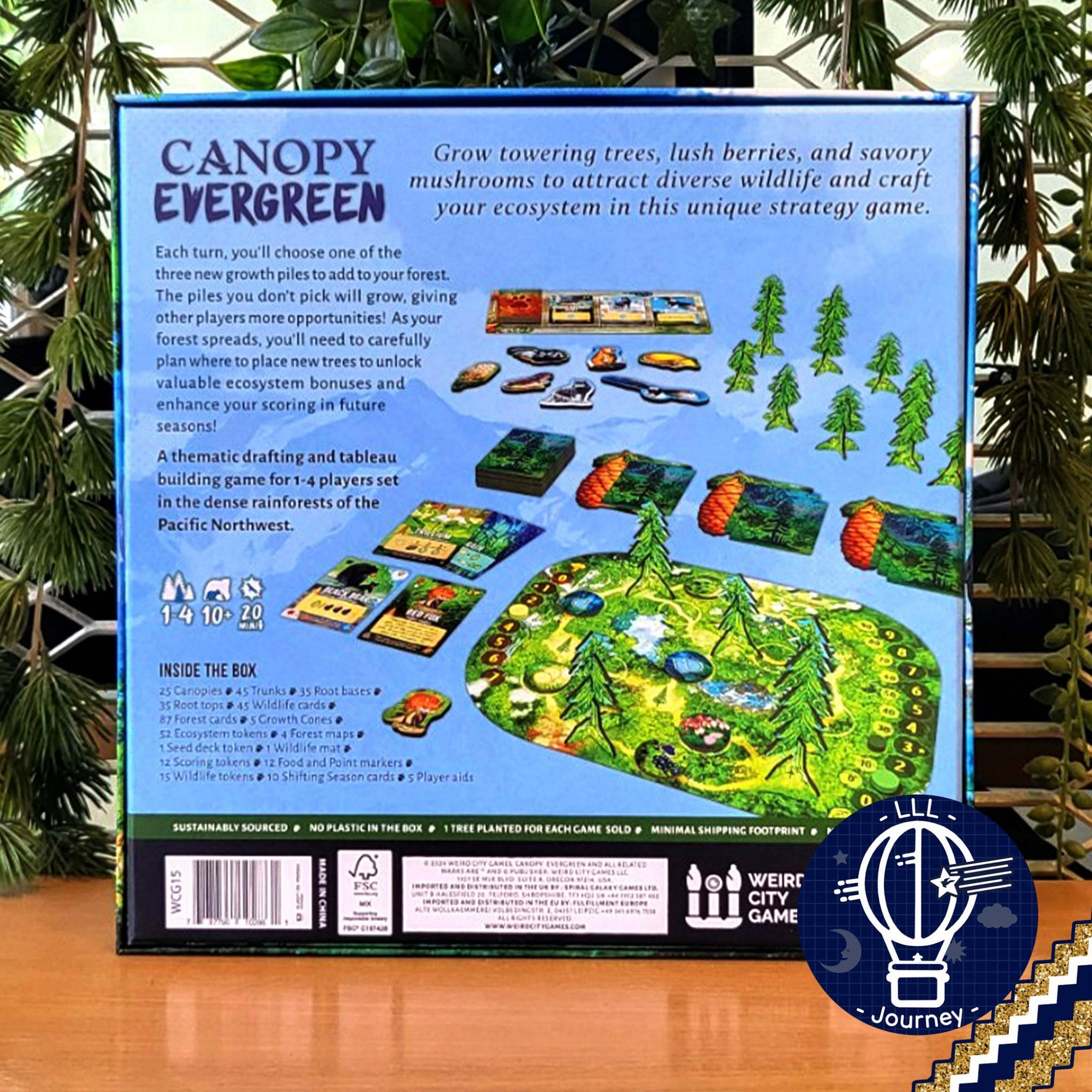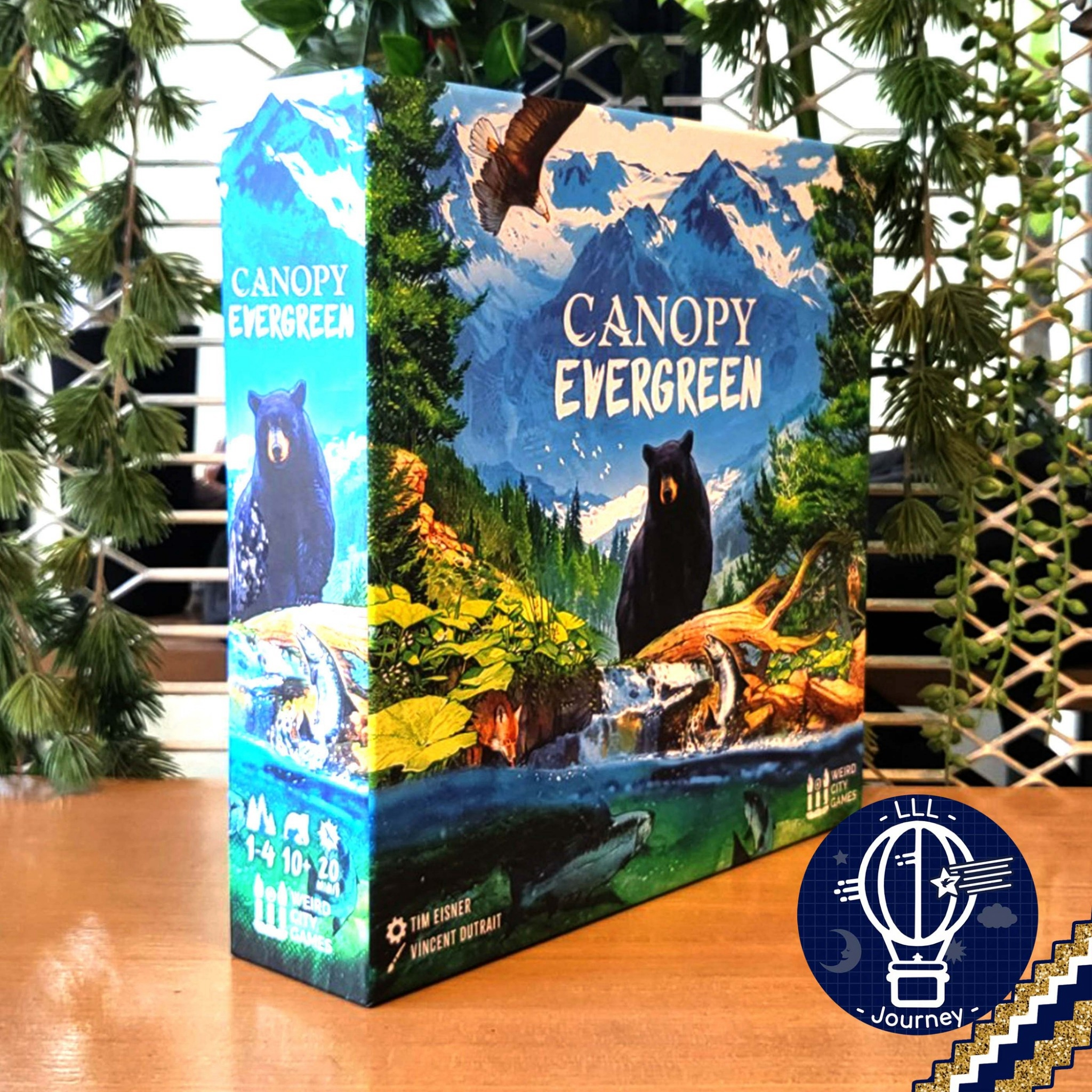 Underneath the dense canopy of the Pacific Northwest rainforests, a thriving ecosystem exists. Schools of salmon swim upstream, wildflowers and lush ferns dot the mossy floor, and a gray wolf looks for its next meal. In Canopy: Evergreen, players compete to grow the tallest trees, collect sets of wild plants, and create bountiful habitats to help native animals thrive.
