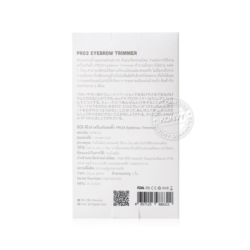Cr.facebook.com/cbgdevicesthailandCBG Devices Pro3 Eyebrow Trimmer ตัดแต่งขนคิ้วและขนส่วนต่างๆ ด้วยนวัตกรรมใหม่ ง่ายต่อการใช้งาน เครื่องกันคิ้ว ทำงานด้วยการใส่ถ่าน AAA 1 ก้อน เพียงกดปุ่มเปิด เครื่องจะทำงานทันที สามารถตัดขนได้อย่างเรียบเนียนและปลอดภัย ไม่ต้องกลัวการบาดเนื่องจากใบมีดจะอยู่ด้านในไม่สัมผัสกับผิวหนังโดยตรง มั่นใจได้เลยว่าปลอดภัยและไม่ก่อให้เกิดอาการระคายเคืองต่อผิวหนัง สินค้ารับประกันนาน 6 เดือน