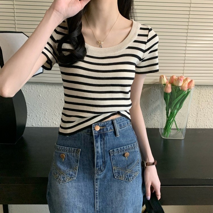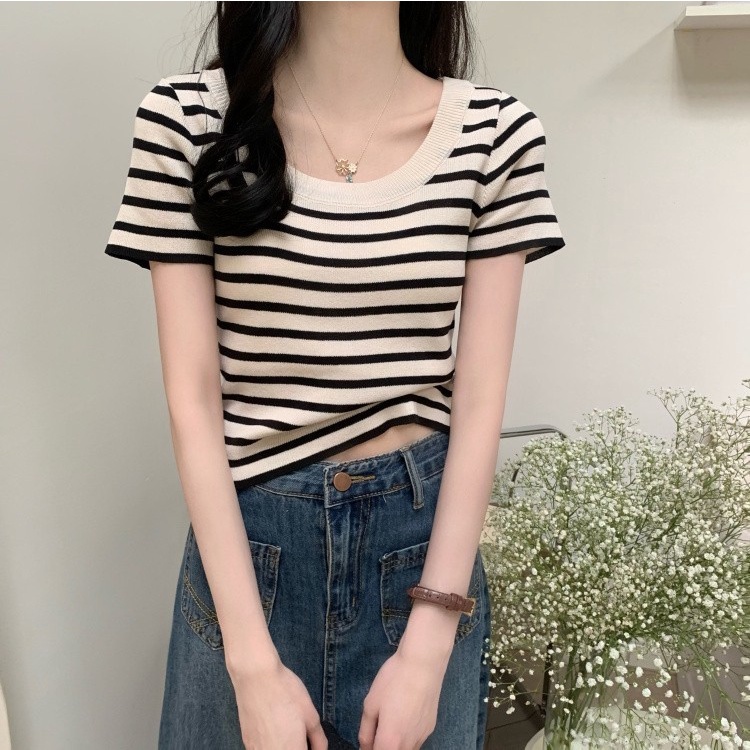 Áo cắt cổ tròn tay ngắn PRP x SPN viền nhún bèo cổ tròn thoải mái cho quán cà phê 45