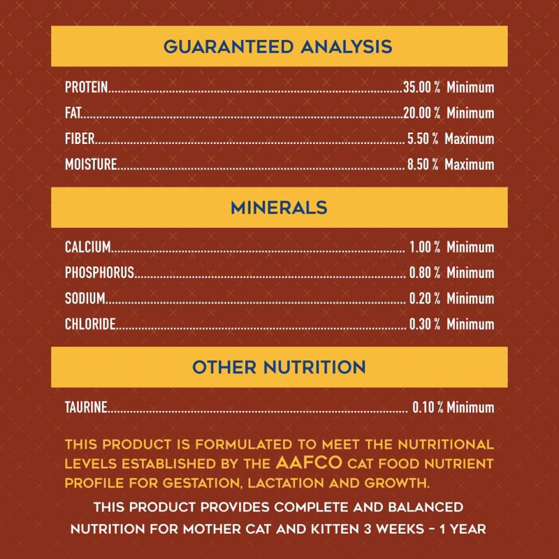 โปรตีนสูงสุดเหมาะกับวัยกำลังเจริญเติบโต ให้ได้ตั้งแต่แมว 3 สัปดาห์ขึ้นไปถึง 1 ปี แมวท้อง แมวที่ให้นมลูกสามารถทานได้