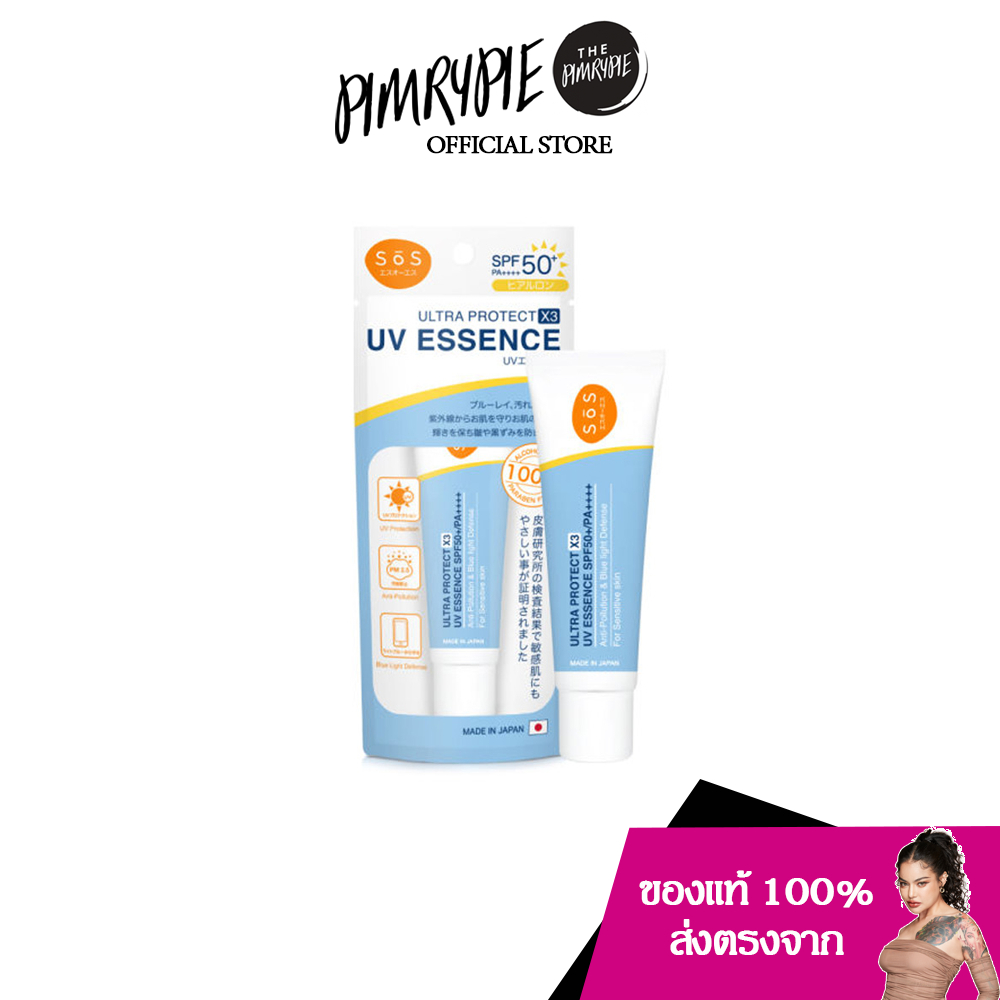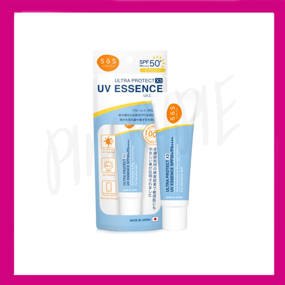 SOS Ultra Protect X3 UV Essence SPF50+/PA++++ 30ml เอสเซนส์กันแดดเนื้อบางเบา ไม่เหนียวเหนอะหนะ ที่ช่วยปกป้องผิวแบบ X3 ทั้งรังสียูวี UVA/UVB, แสงสีฟ้า และมลภาวะต่างๆ โดยจะทำหน้าที่เป็นฟิลม์บางๆ บนผิวคอยดูดซับรังสียูวี และแสงสีฟ้า พร้อมทั้งดักจับสิ่งสกปรก โลหะหนัก ควันบุหรี และฝุ่นละอองขนาดเล็ก (PM 2.5) ไม่ให้ซึมสู่ผิว หรืออุดตันรูขุมขน ด้วยสูตรเฉพาะไฮยาลูรอนผสานกับวิตามินอี จึงช่วยฟื้นฟูและปกป้องผิวจากอนุมูลอิสระ และชะลอการเกิดริ้วรอยก่อนวัย อันเกิดสิ่งเร้าภายนอกได้ดวย