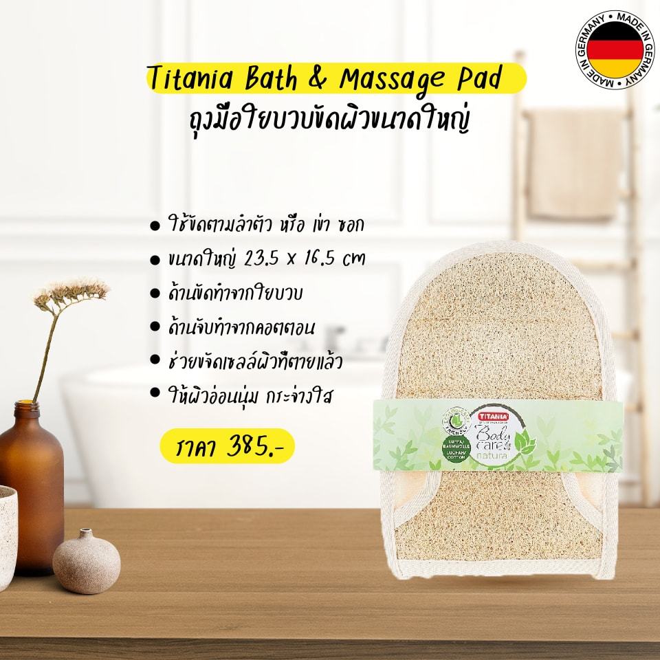 TITANIA Bath and Massage Glove เป็นถุงมือขัดผิวที่ทำจากเนื้อผ้าCotton ผสมใยบวบช่วยในการทำความสะอาดผิวและนวดผิวในขณะเดียวกัน