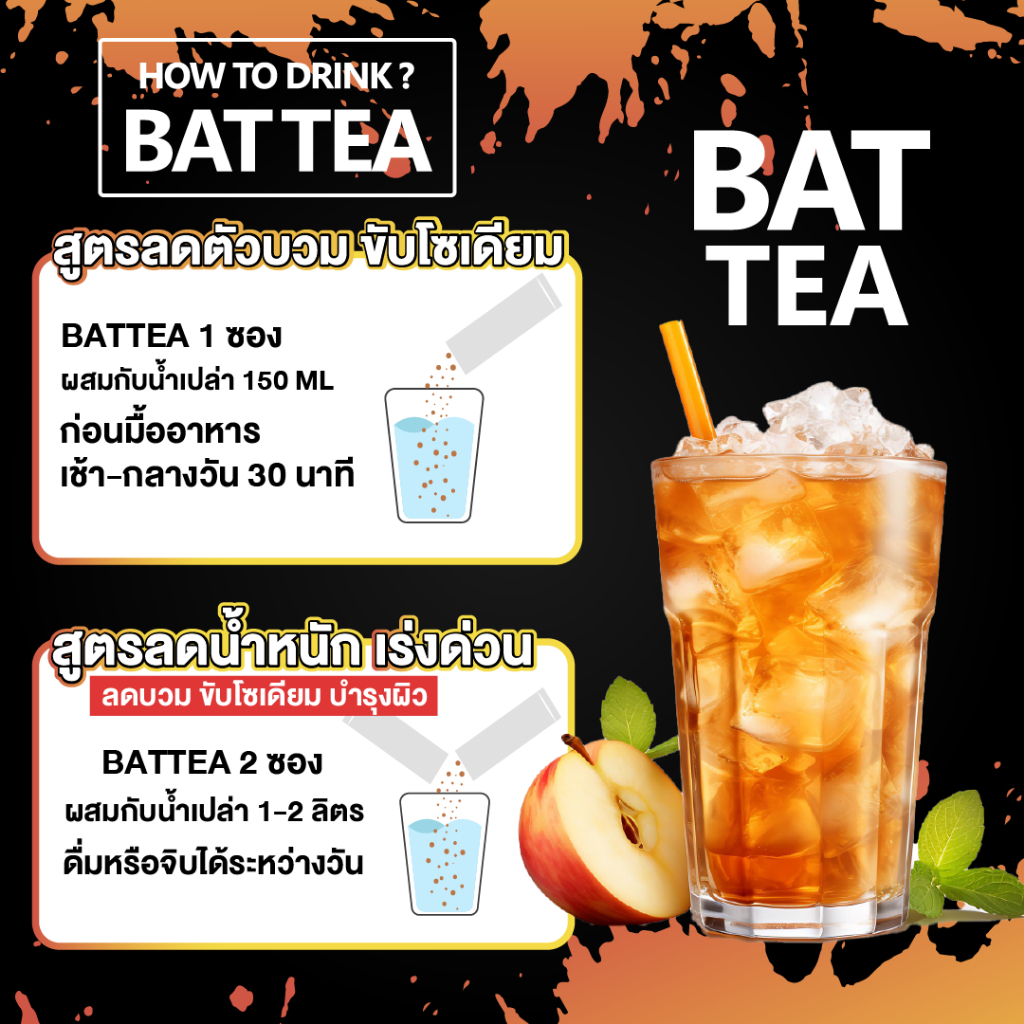 สูตรลดตัวบวม ขับโซเดียม BAT TEA 1 ซอง ผสมกับน้ำเปล่า 150 ML ก่อนมื้ออาหาร เช้า-กลางวัน 30 นาที