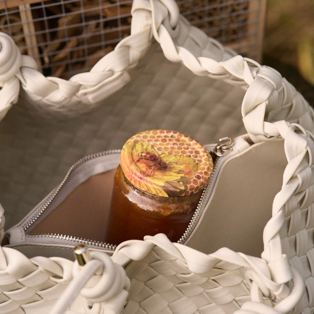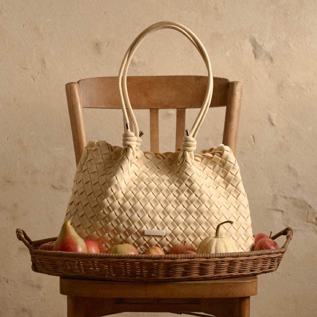inspired มาจาก การใช้วัสดุจากธรรมชาติ ตัวกระเป๋าทำมาจากยางธรรมชาตินำมาสานด้วยเทคนิคhandmade ผ่านวิธีการผลิตให้เป็นผ้ามีความยืดหยุ่น มีฐานรองด้านล่างและมีช่องซิปตรงกลาง