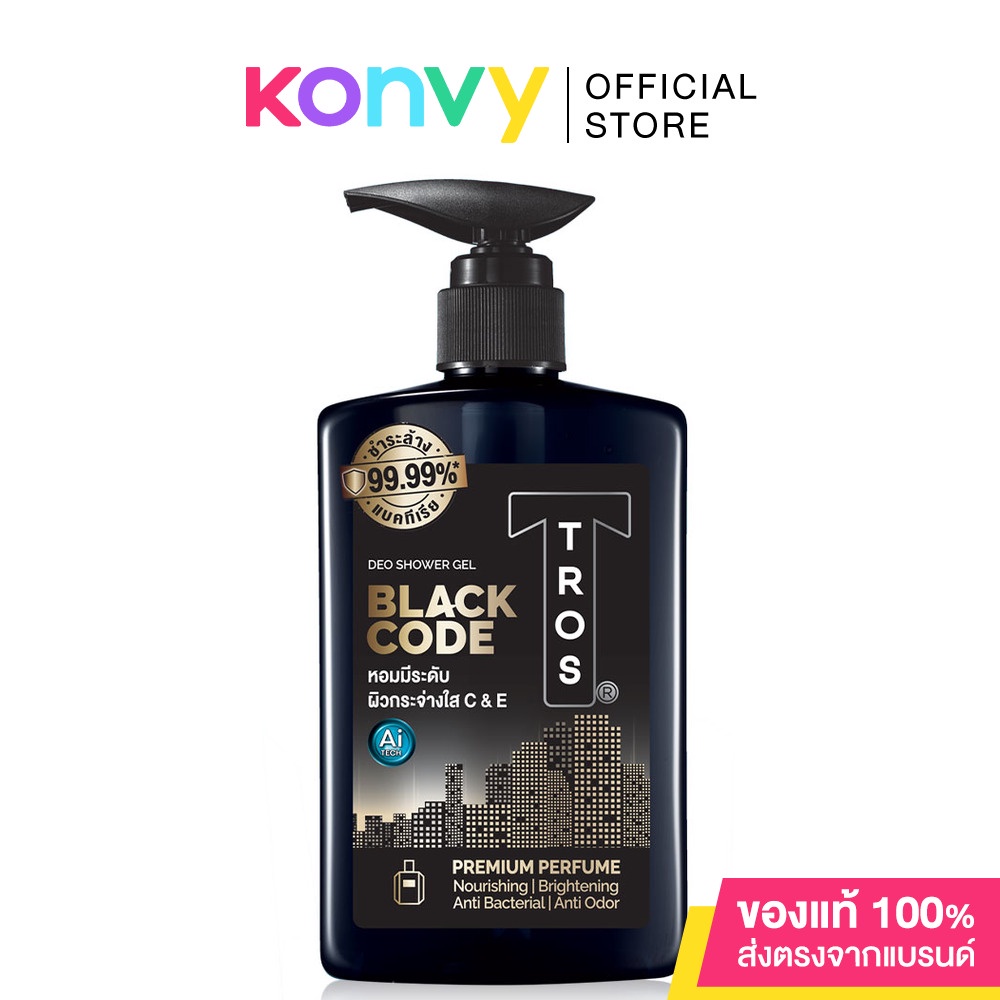 •TROS Black Code Deo Shower Gel 450ml ครีมอาบน้ำที่ออกแบบมาสำหรับผู้ชาย กลิ่นหอมคัดสรรโดย AI ACTIMOOD TECH ผ่านการทดสอบดมกลิ่นและปรับอารมณ์โดยวัดจากคลื่นสมอง แนวกลิ่นหอมเท่ เสริมสร้างแรงดึงดูด ผสานการบำรุงสารสกัด VITAMIN C & E ช่วยให้ผิวกระจ่างใส และ ODOR PAUSE TECH ระงับกลิ่นได้ยาวนาน พร้อมชำระล้างแบคทีเรีย