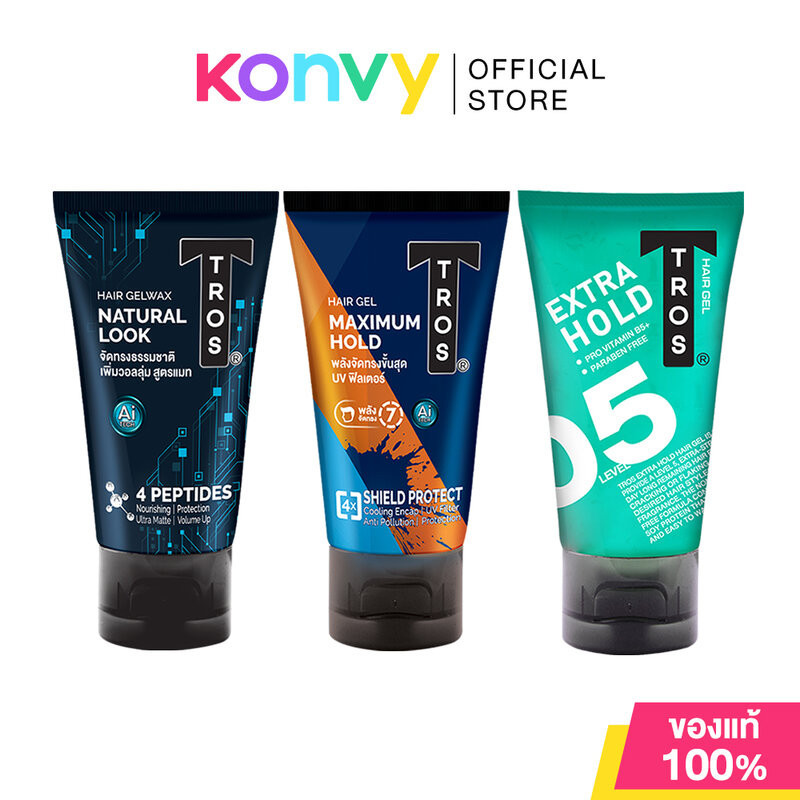 •TROS Hair Gel Ai Natural Look 45ml ผลิตภัณฑ์จัดแต่งทรงผม ที่ช่วยให้ดูดีอย่างเป็นธรรมชาติ มีสไตล์ ปกป้องผมให้อยู่ทรงนานตลอดวัน•TROS Hair Gel Ai Maximum Hold 45ml ผลิตภัณฑ์จัดแต่งทรงผม ที่ช่วยให้ดูดีอย่างเป็นธรรมชาติ มีสไตล์ ปกป้องผมให้อยู่ทรงนานตลอดวัน พลังจัดทรงสูงระดับ 7 พร้อมบำรุงผมจาก AI Peptide