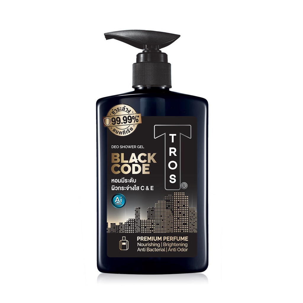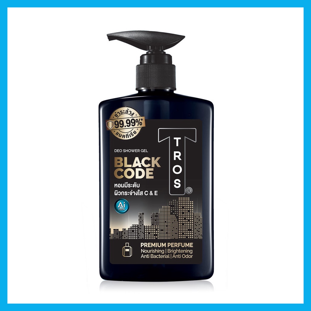 Cr.facebook.com/TROSThailandTROS Black Code Deo Shower Gel 450ml ครีมอาบน้ำที่ออกแบบมาสำหรับผู้ชาย กลิ่นหอมคัดสรรโดย AI ACTIMOOD TECH ผ่านการทดสอบดมกลิ่นและปรับอารมณ์โดยวัดจากคลื่นสมอง แนวกลิ่นหอมเท่ เสริมสร้างแรงดึงดูด ผสานการบำรุงสารสกัด VITAMIN C & E ช่วยให้ผิวกระจ่างใส และ ODOR PAUSE TECH ระงับกลิ่นได้ยาวนาน พร้อมชำระล้างแบคทีเรีย 99.99%