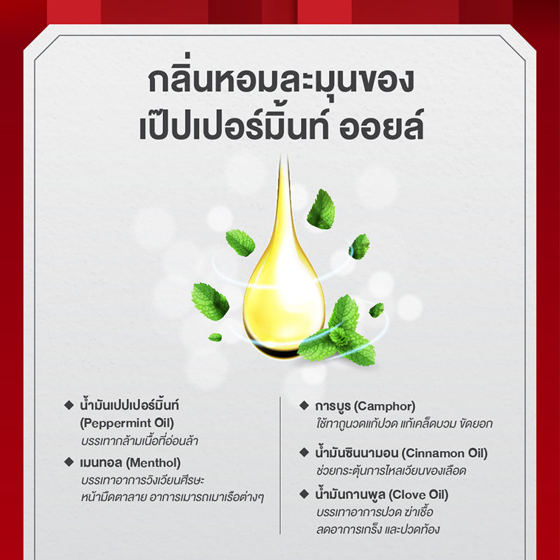 ส่วนประกอบสำคัญ : น้ำมันเปปเปอร์มิ้นท์(Peppermint Oil) เมนทอล(Menthol) น้ำมันซินนามอน(Cinnamon Oil) น้ำมันกานพูล(Clove oil) การบูร(Camphor)