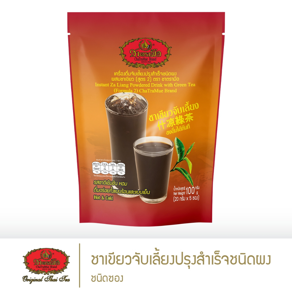 เครื่องดื่มจับเลี้ยงปรุงสำเร็จชนิดผงผสมชาเขียว ตรา ชาตรามือ