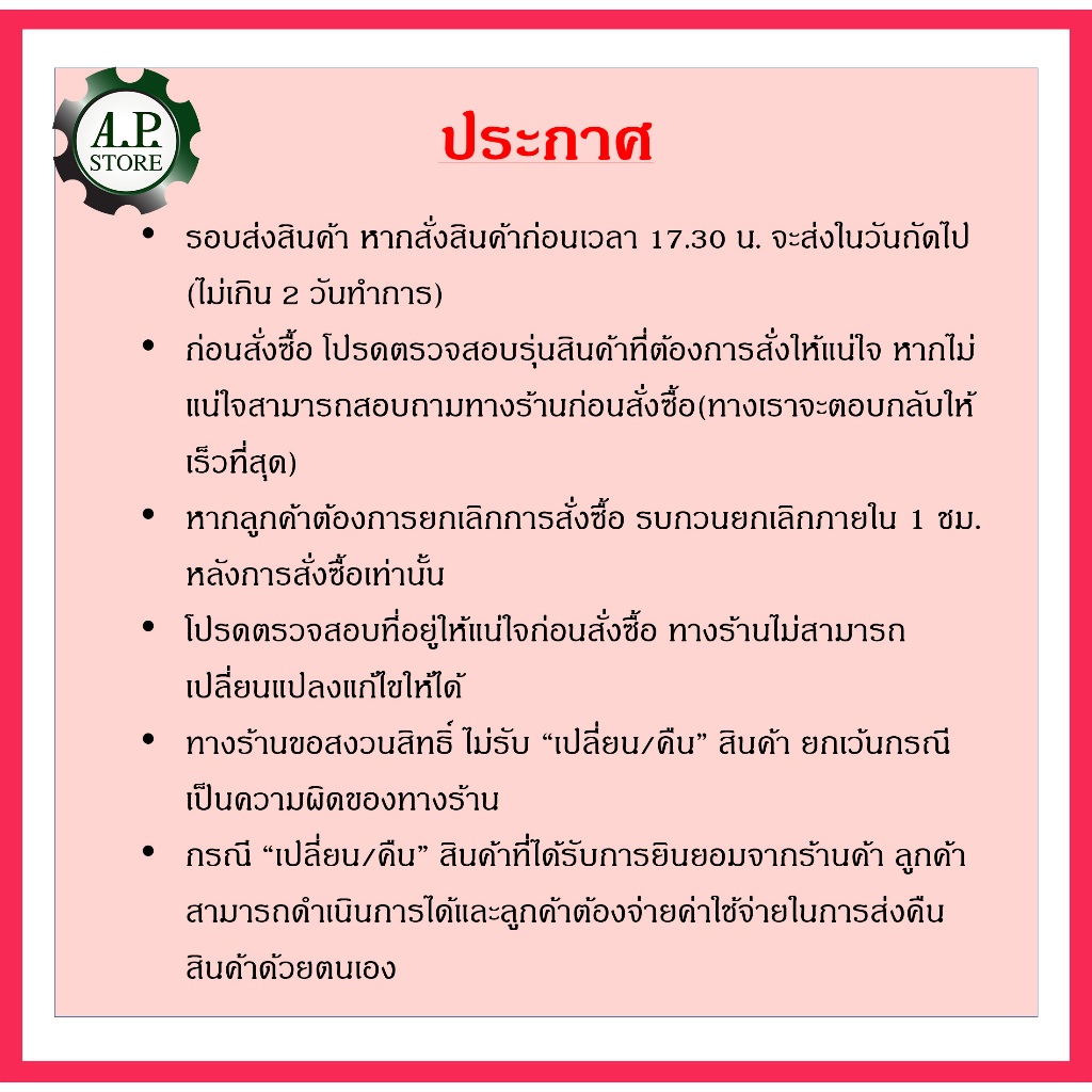 6. ในการเปลี่ยนสินค้า ต้องส่งสินค้าที่แจ้งมาเพื่อตรวจสอบก่อน โดยผู้ซื้อเป็นผู้ออกค่าใช้จ่ายในการส่งมาให้ทางร้าน