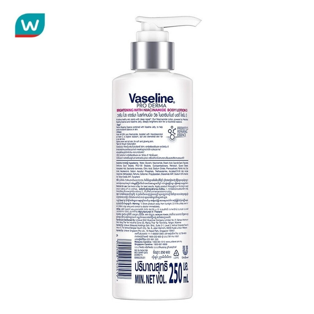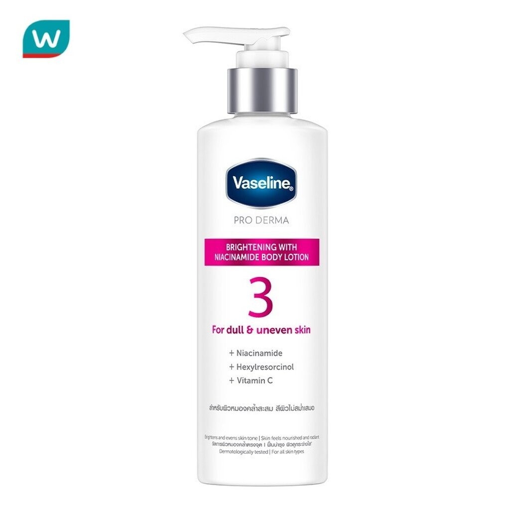 รายละเอียดสินค้าวาสลีน โปร เดอร์มา ไนอาซินาไมด์ ไบรท์เทนนิ่ง บอดี้ โลชั่น โลชั่นเซรั่มเข้มข้น ที่ผสานไนอาซินาไมด์บริสุทธิ์ 99% เฮกซิลรีซอร์ซินอล และ เรสเวอราทรอล จัดการต้นเหตุผิวหมองคล้ำและจุดด่างดำ เผยผิวดูกระจ่างใส เปล่งประกาย พร้อมช่วยฟื้นสมดุลไมโครไบโอม เกราะปกป้องผิว ครั้งแรก ของบอดี้แอมพลู เข้มข้นเหมือนเซรั่มผิวหน้า เพื่อผิวกายดูพอร์เฟค 1.จากสุดยอดผลิตภัณฑ์บำรุงผิวหน้าในรูปแอมพลู มาสู่บอดี้แอมพลูผิวกาย 2.จากสุดยอดของส่วนผสมที่เข้มข้น 3.จะบำรุงให้ผิวกายดูพอร์เฟคเหมือนผิวหน้า 99% ไนอาซินาไมด์บริสุทธิ์ 3D กระจ่างใสทุกมิติ โดยแอมพลูจะตรงเข้าถึงเม็ดสีเมลาโทนินต้นเหตุของจุดด่างดำเผยผิวกายที่กระจ่างใส