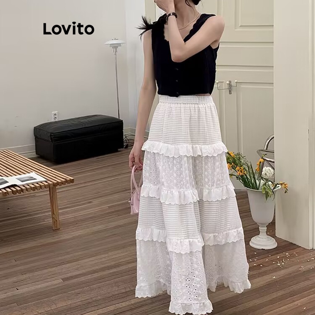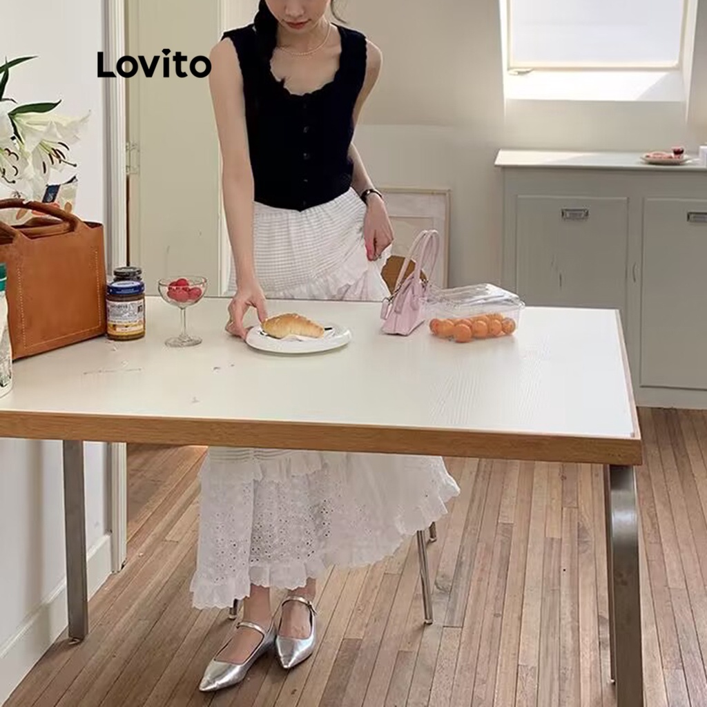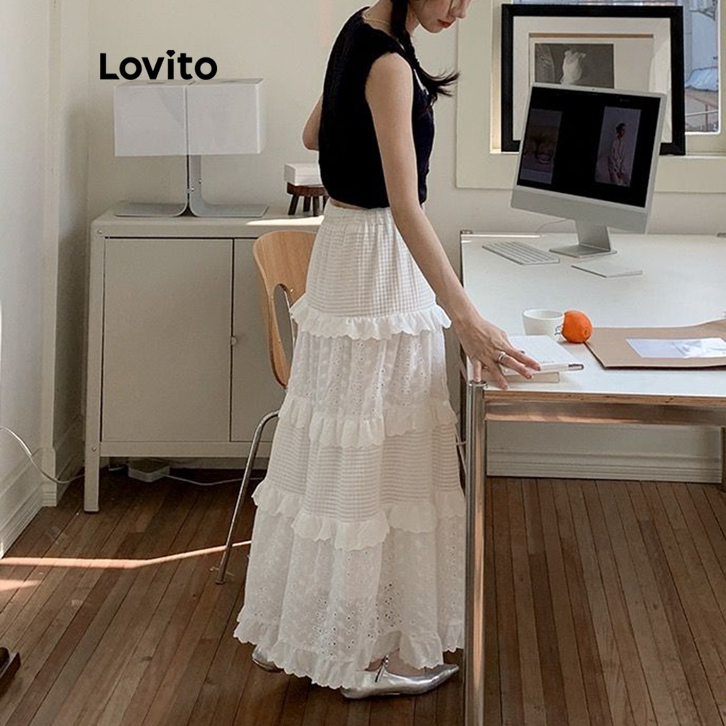 Lovito Chân váy midi đuôi có khóa kéo màu trơn thường ngày cho Nữ lne09201 (Hoa mai)