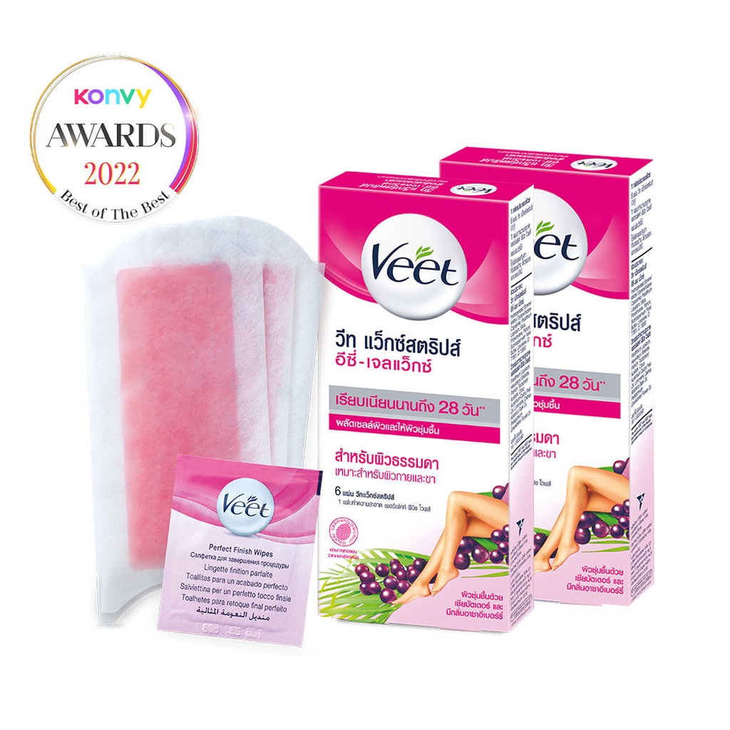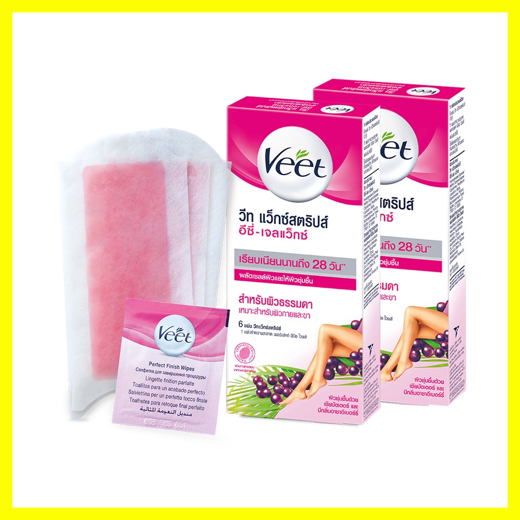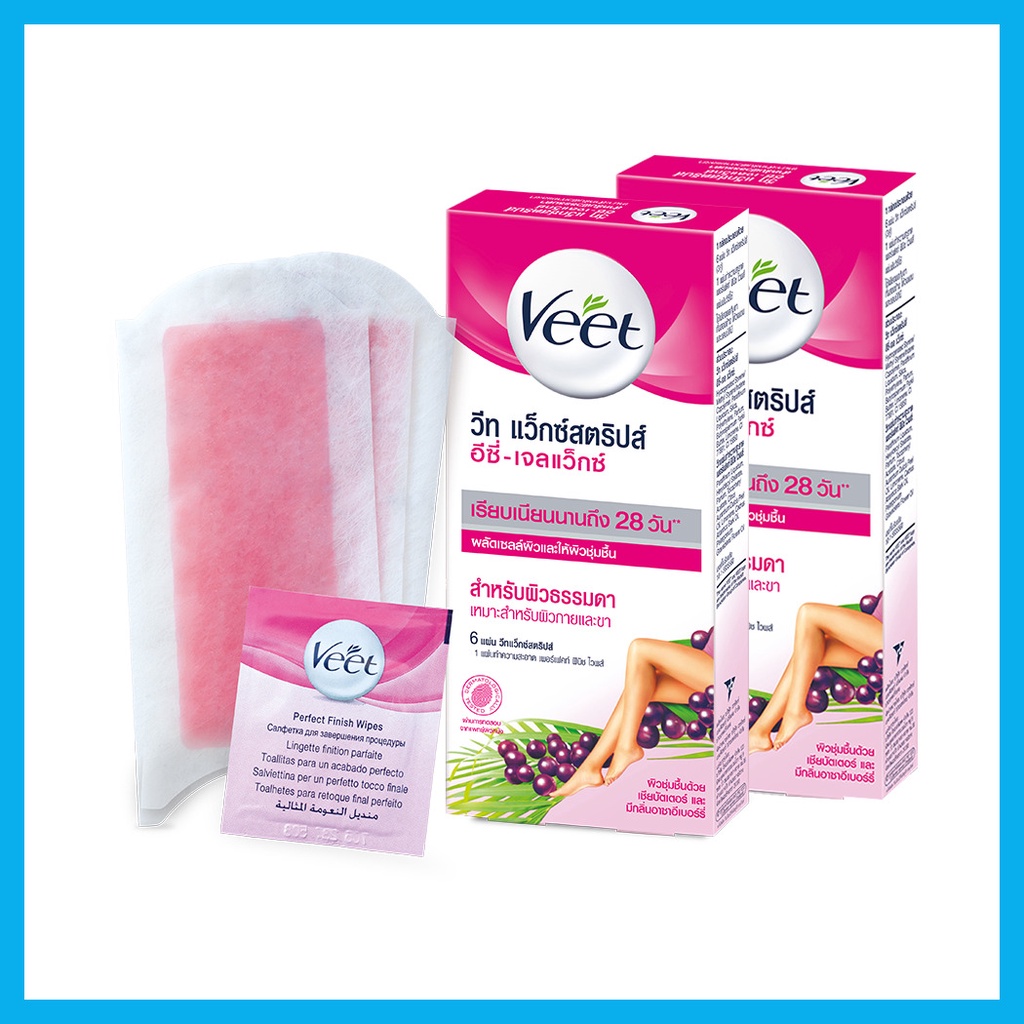 Veet Hair Removal Waxstrips Shea Butter and Berry [6Sheets x 2Boxes]แว็กซ์สตริปส์ ให้คุณมีผิวเรียบเนียนปราศจากขนยาวนาน สูตรพิเศษที่มีส่วนผสมของเชีย บัตเตอร์ อันมีคุณสมบัติช่วยคงความชุ่มชื้นของผิว และกลิ่นหอมจากเบอร์รี่จึงเหมาะสำหรับผิวธรรมดา มาพร้อมกับแถบโค้งอีซี่กริป เพิ่มความสะดวกในการดึงแผ่นแว็กซ์อย่างผู้เชี่ยวชาญ ให้คุณขจัดขนได้ถึงรากง่ายๆ ในครั้งเดียว(1 กล่อง ประกอบด้วย วีท แว็กซ์สตริปส์ จำนวน 3 คู่ (6 แผ่น) และ แผ่นเพอร์เฟคท์ ฟินิช ไวฟ์)