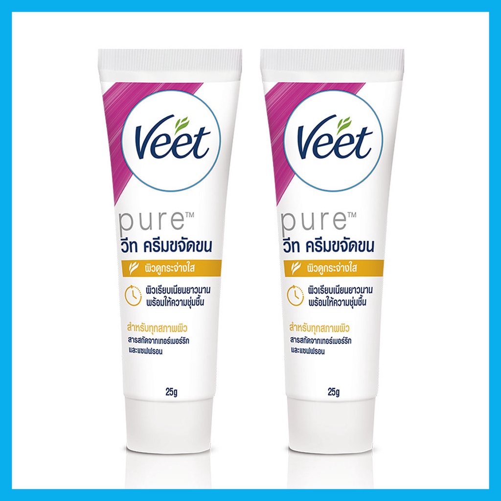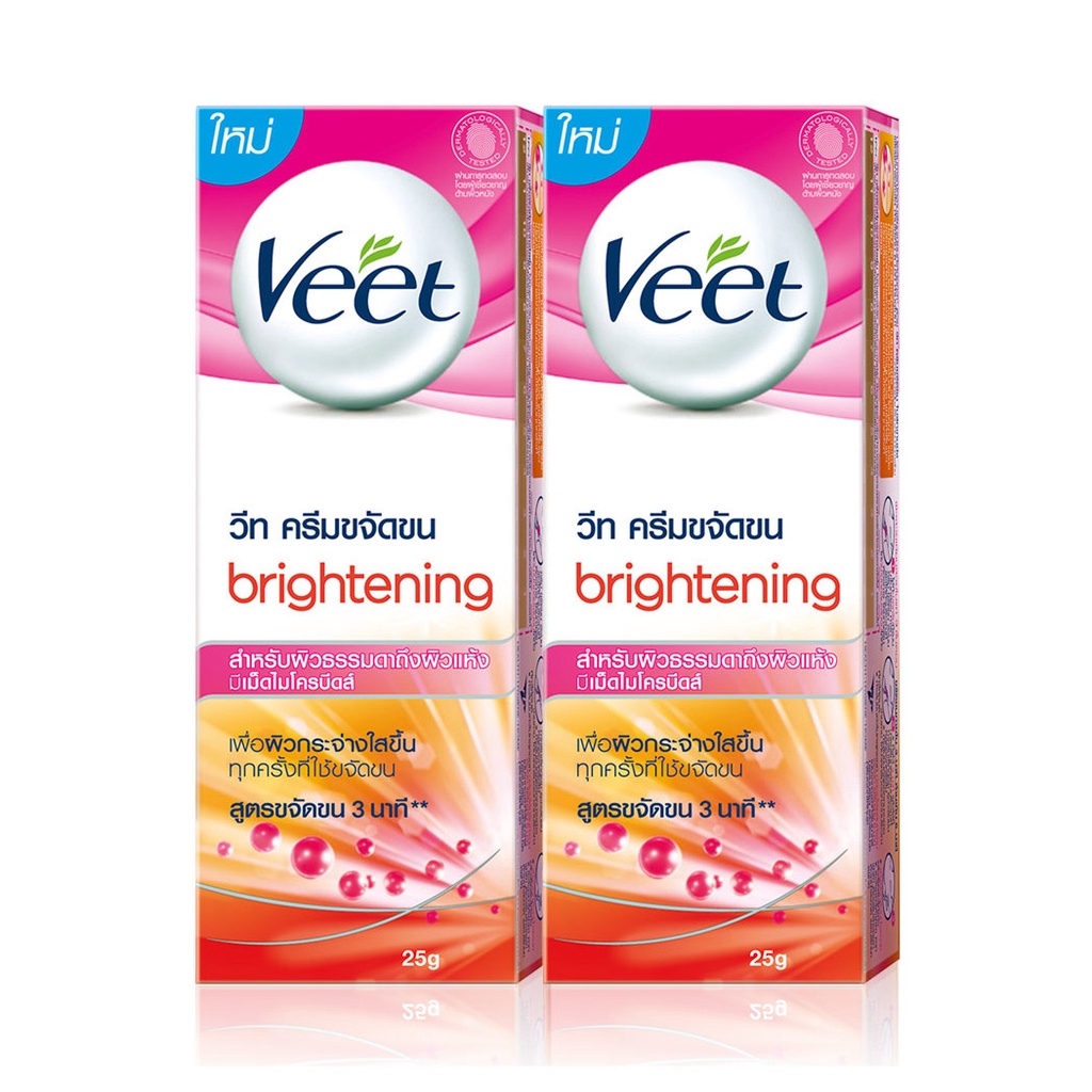 Veet Hair Removal Cream Brightening with Microbeads Normal to Dry Skin [25g x 2pcs]ครีมขจัดขนสำหรับผิวธรรมดาถึงผิวแห้ง ด้วยสูตรผสมไมโครบีดส์ ช่วยขจัดขนอย่างง่ายดาย พร้อมขจัดเซลล์ผิวเก่าให้หลุดออกอย่างอ่อนโยน เผยผิวดูเรียบเนียน กระจ่างใสขึ้นทุกครั้งหลังการขจัดขน พร้อมมอบกลิ่นหอมสดชื่น• สำหรับผิวธรรมดาถึงผิวแห้ง