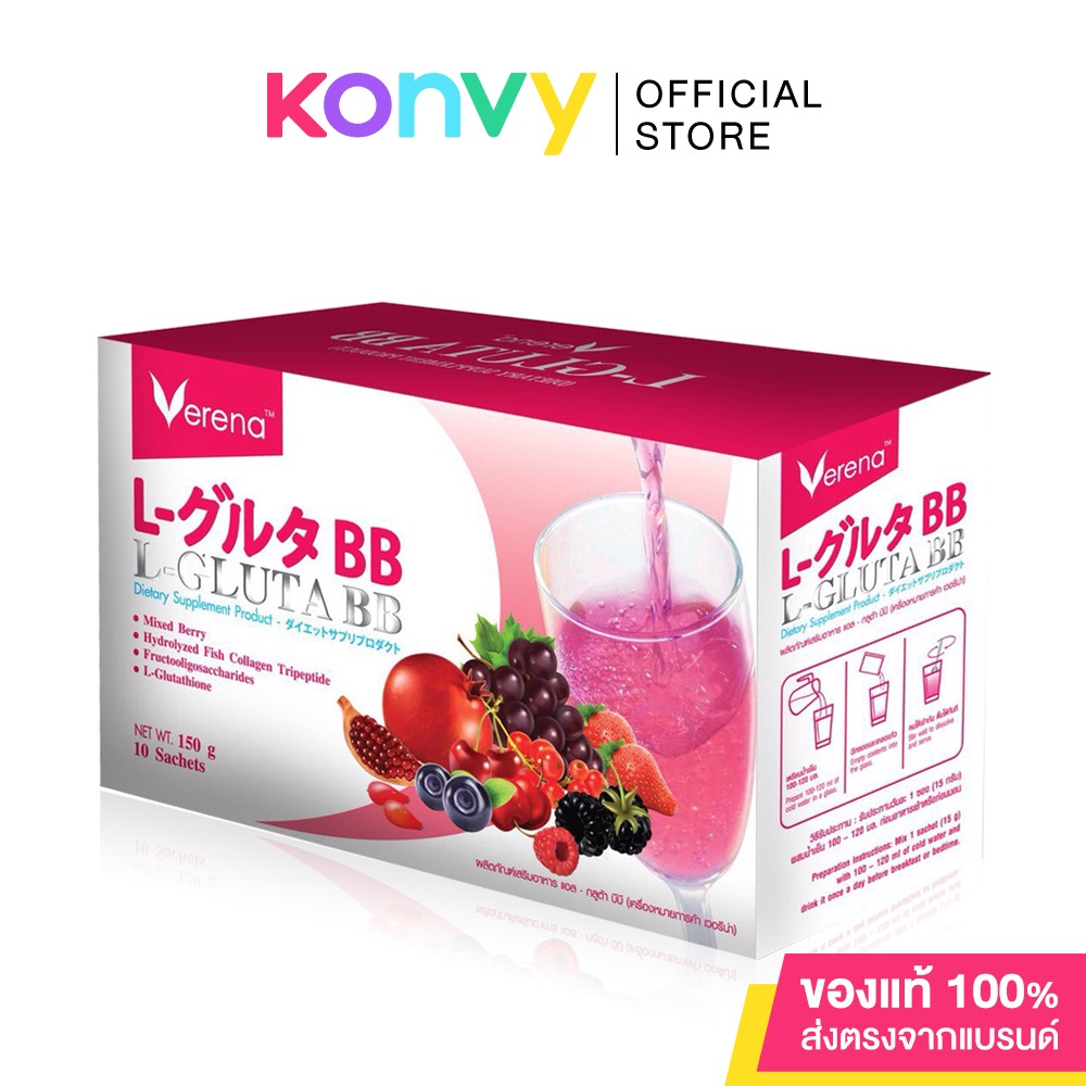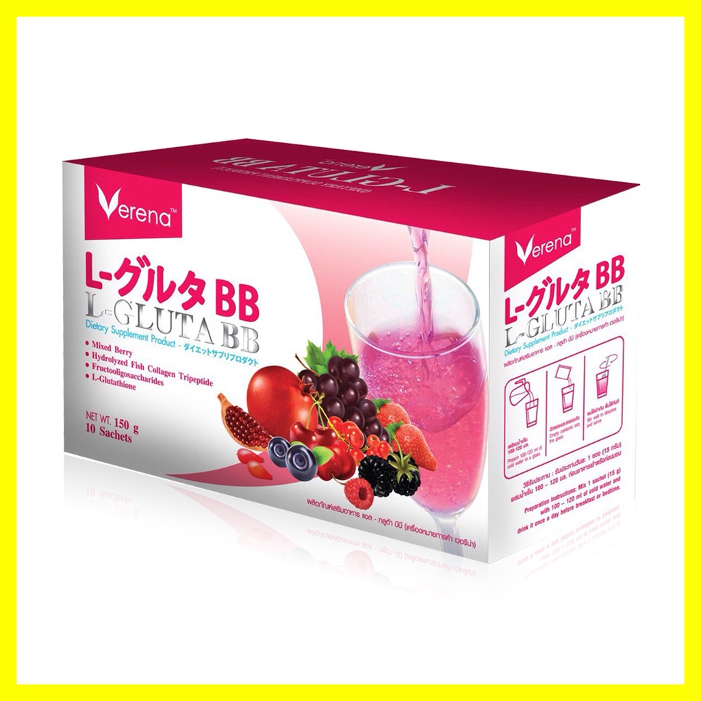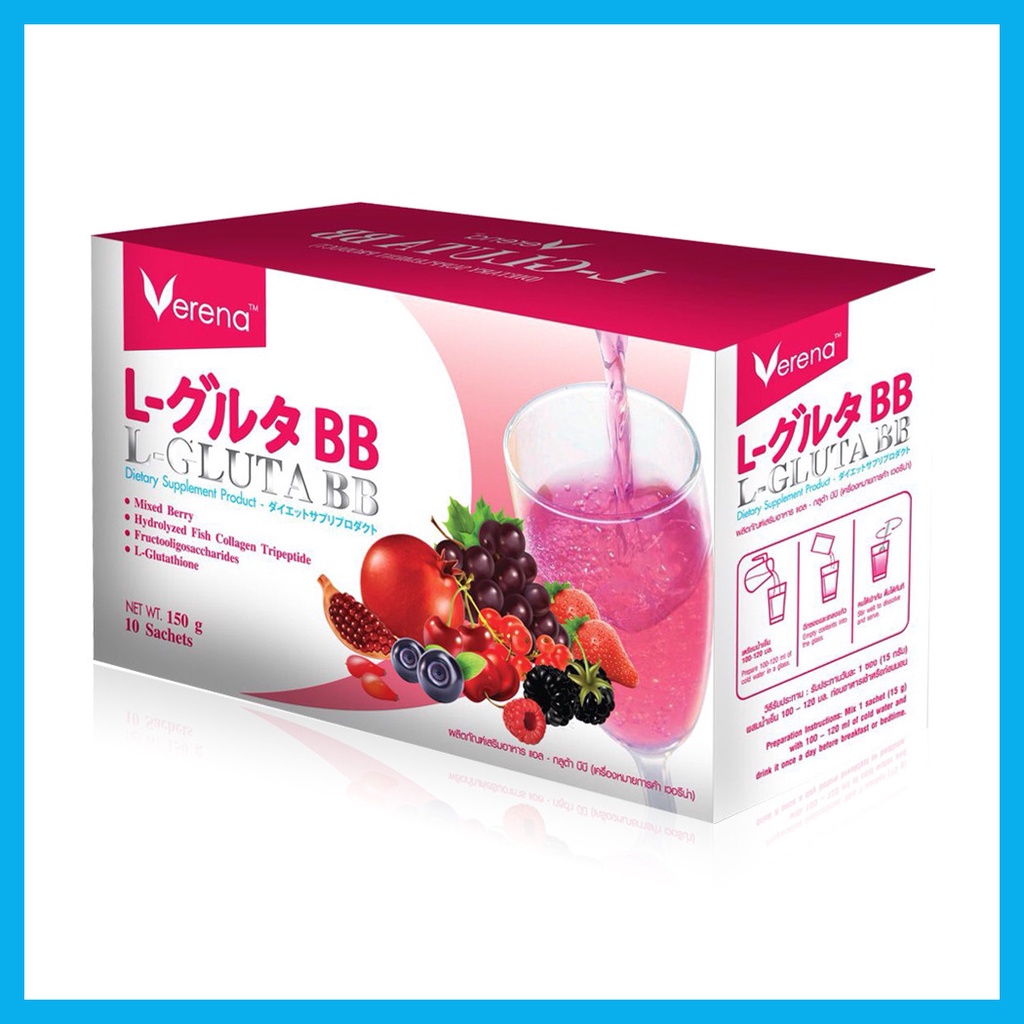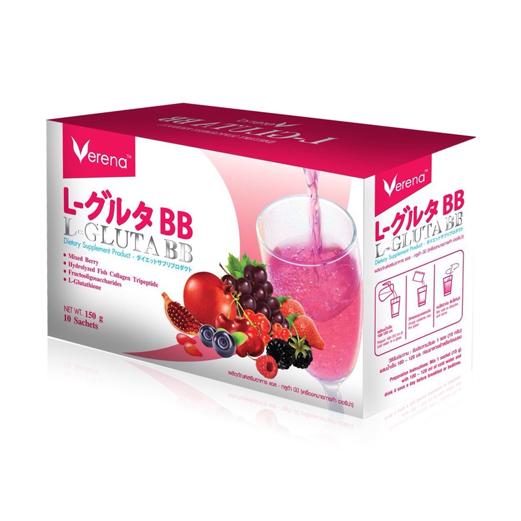 Verena L-Gluta BB 10 Sachets ผลิตภัณฑ์เสริมอาหารด้วยคุณค่าของแอล-กลูต้าไธโอน เกรดพรีเมี่ยม จากประเทศญี่ปุ่นผสานคุณค่าจากคอลลาเจนไตรเปปไทด์ อุดมด้วยสารสกัดเข้มข้นจากมิกซ์เบอรี่ 10 ชนิด•มีส่วนประกอบของแอล-กลูต้าไธโอน เกรดพรีเมี่ยม นําเข้าจากประเทศจากประเทศญี่ปุ่น